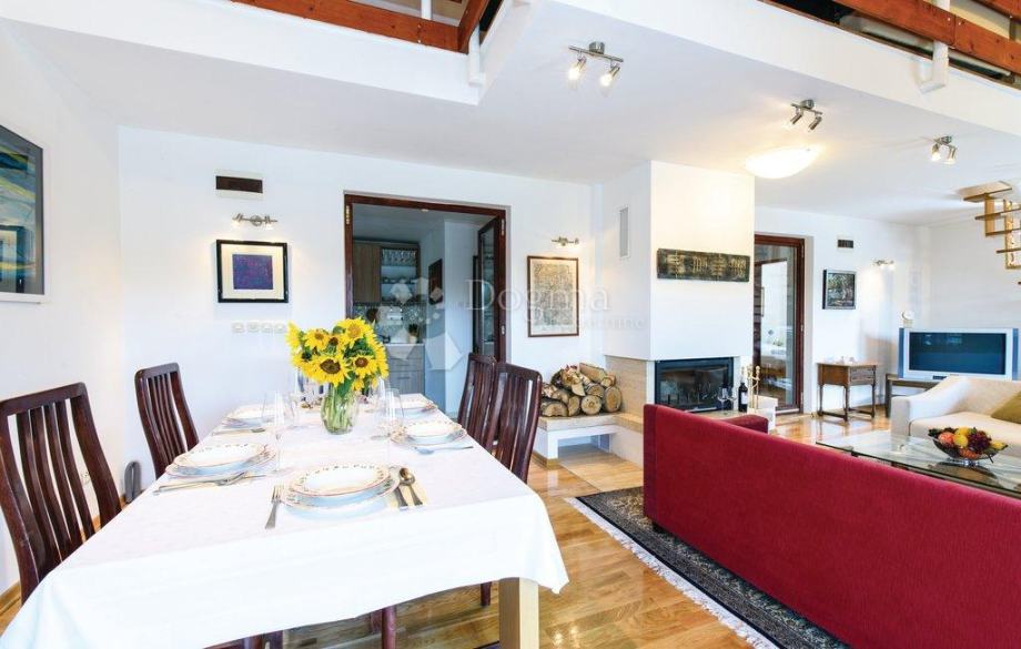 Prva etaža obuhvaća kuhinju, dnevni boravak, blagovaonicu, jednu spavaću sobu te kupaonicu s toaletom.