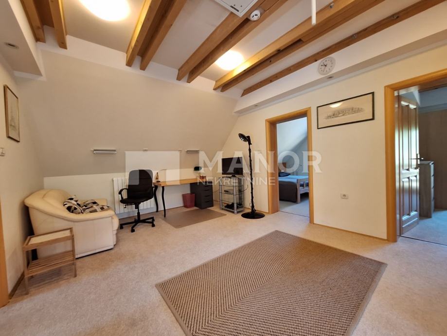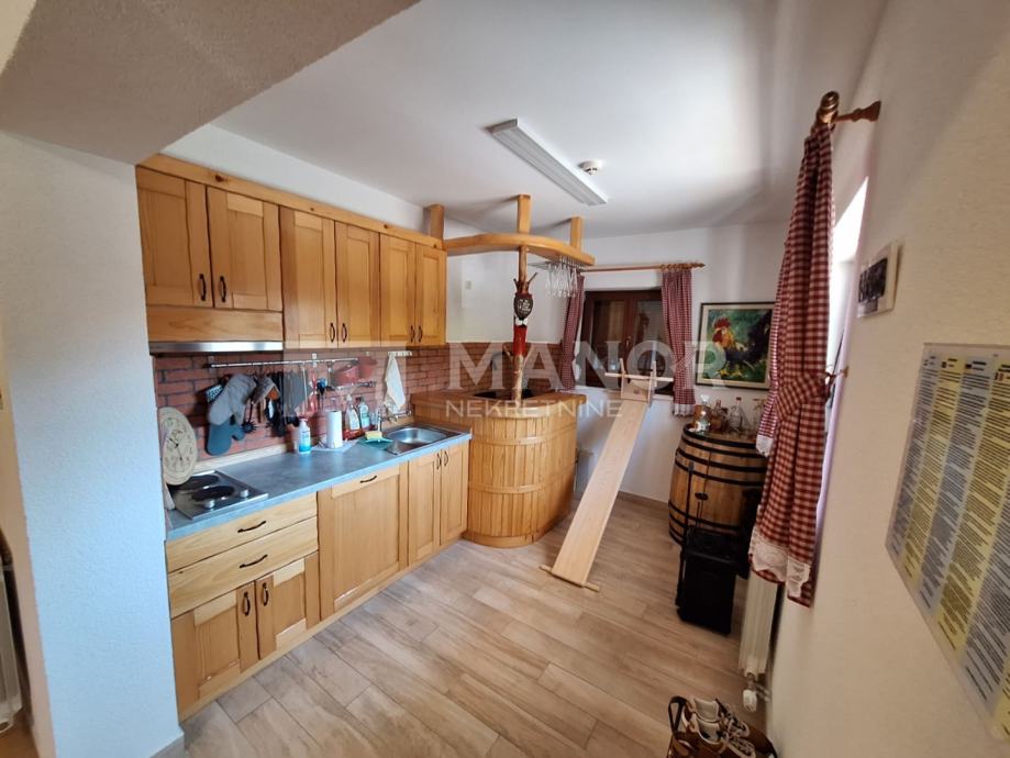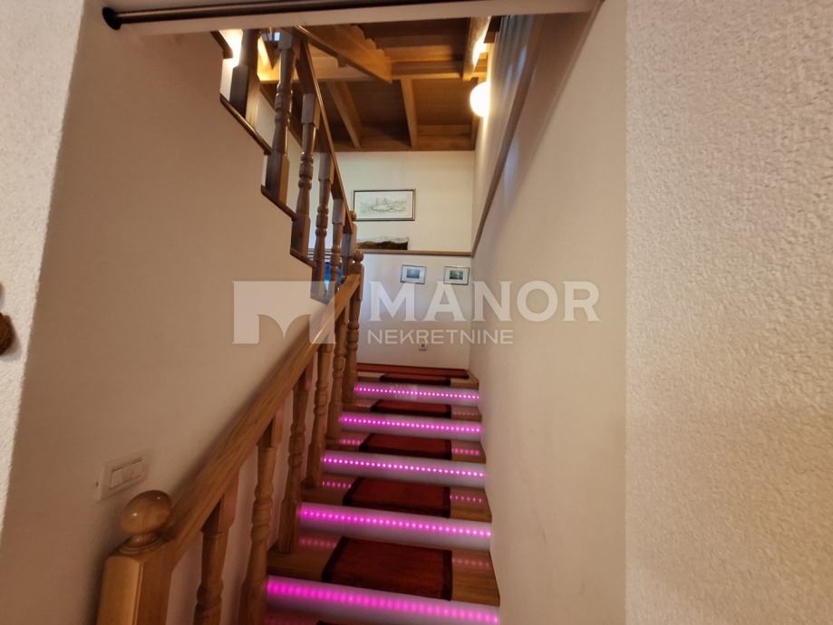 Kuća je koncipirana kao katnica, ima stambenu površinu 250 m2, pripadajuću okućnicu i garažu.