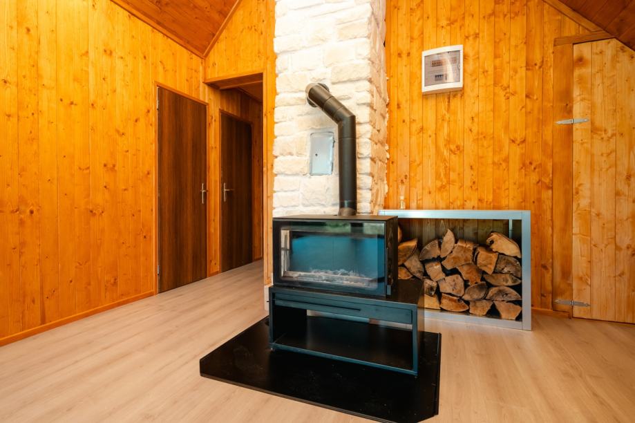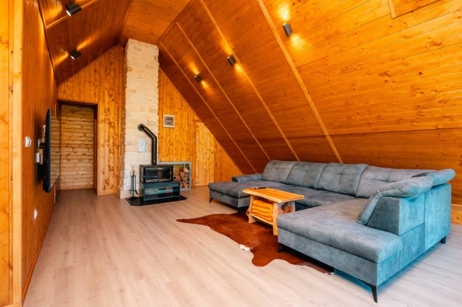Stambeni prostor raspoređen je kroz tri etaže i zamišljen kao cjelina, s jasno odvojenim zonama za boravak i odmor. U suterenu se nalazi ukopana konoba, autentičan prostor idealan za vinsku kolekciju ili druženja u toplom planinskom ambijentu.
