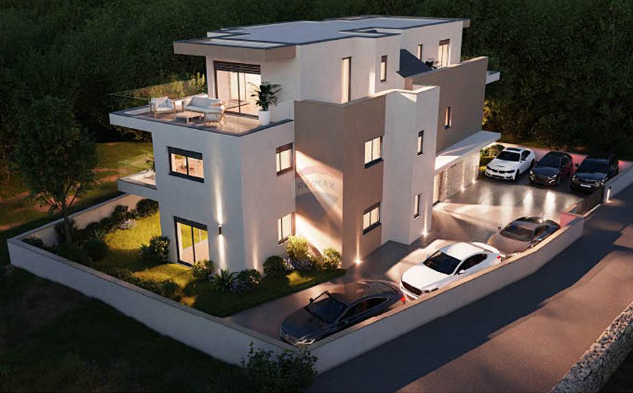 Dodatno, apartman ima dva vanjska parkirališna mjesta ukupne površine 28,85 m², a spavaće sobe opremljene su balkonskim vratima s izlazom na terasu/dvorište.