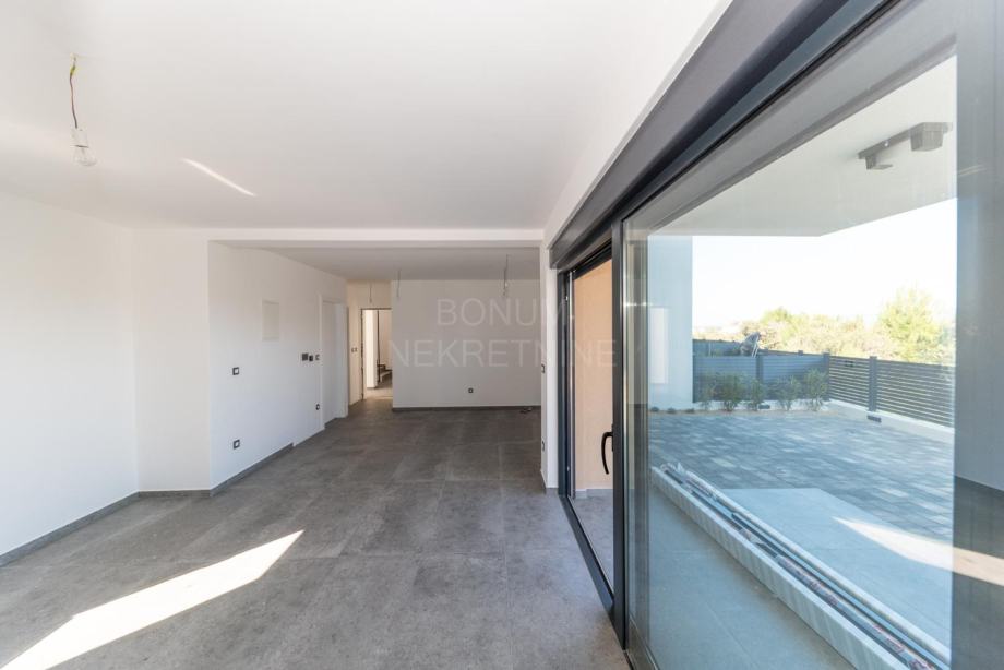 Prodaje se novi atraktivan apartman (AP1) s vrtom u prizemlju na mirnoj lokaciji 350 m od mora. Apartman se sastoji od dvije spavaće sobe, kupaonice, prostrane kuhinje sa blagovaonom i dnevnim boravkom u cjelini sa izlazom na veliku natkrivenu terasu 12,50 m² povezan s prostranim vlastitim od 87,21 m². Apartmanu pripadaju i dva parkirna mjesta ispred zgrade. Stan je opremljen suvremenim sadržajima za maksimalnu udobnost.