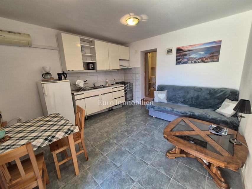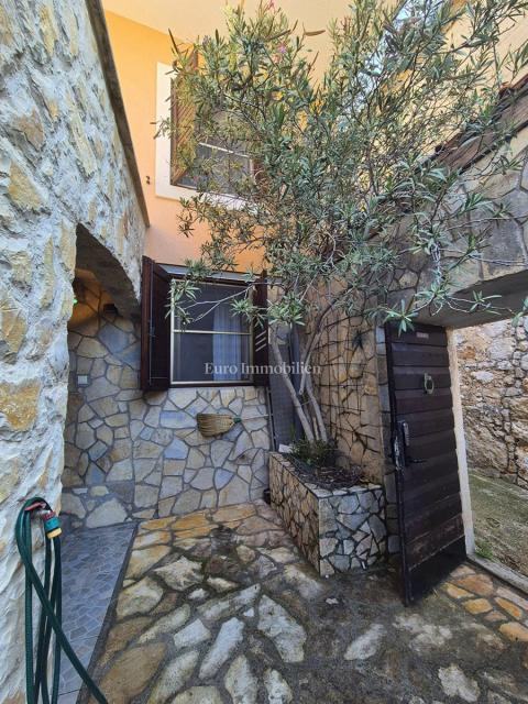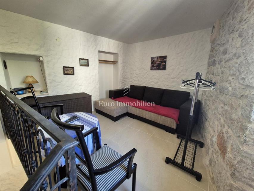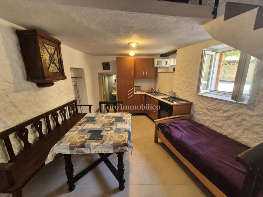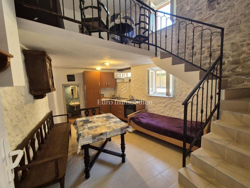 Galerija – Apartman s posebnim ulazom, uređen u mediteranskom stilu s vidljivim kamenom na zidovima, originalnim kamenim stropom u kupaonici smještenom na mjestu stare gusterne. Opremljena kuhinja, klima uređaj za grijanje i hlađenje.
