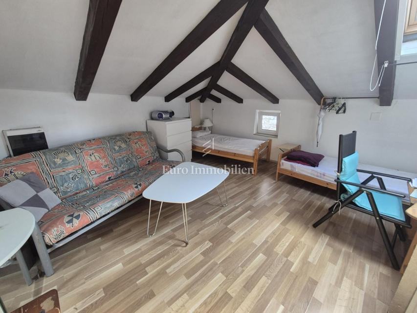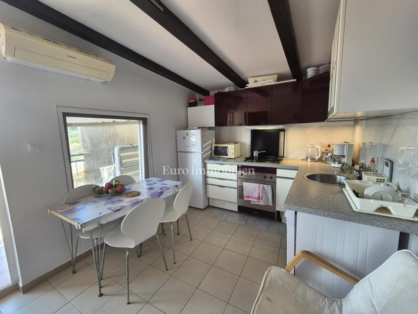 Potkrovlje – Dvije spavaće sobe, potpuno opremljena kuhinja s perilicom, kupaonica s perilicom rublja i velika terasa s pogledom na more i Kornate.