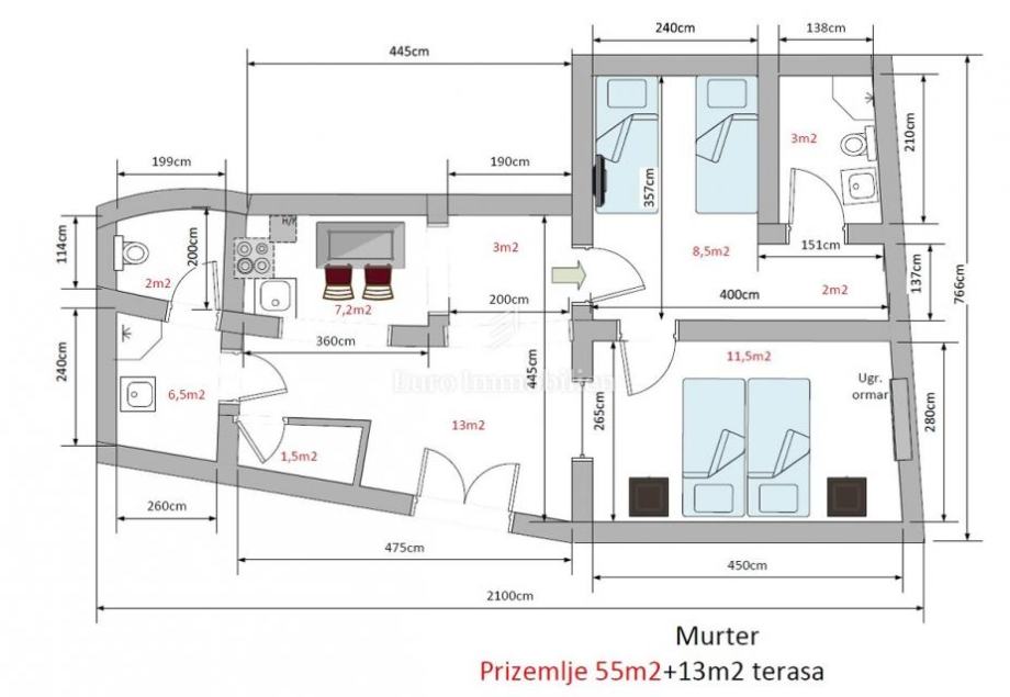 Ukupna stambena površina iznosi 158m2 (ne računajući unutarnje zidove) te ima dvije prostrane terase od 53 m2.
