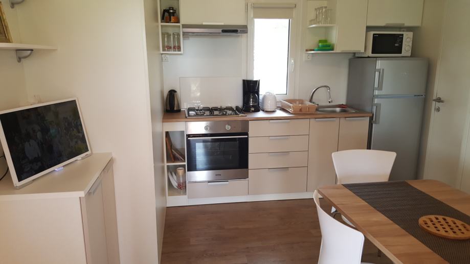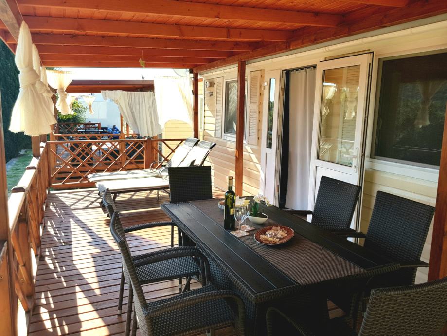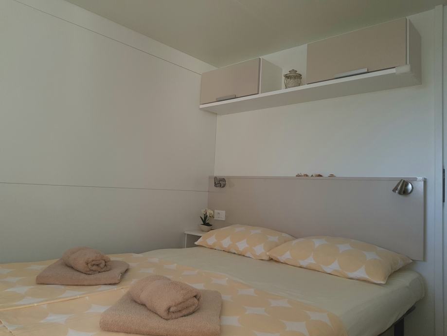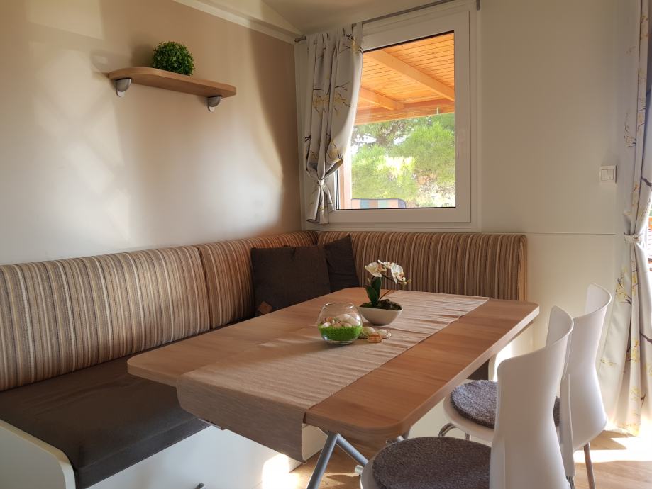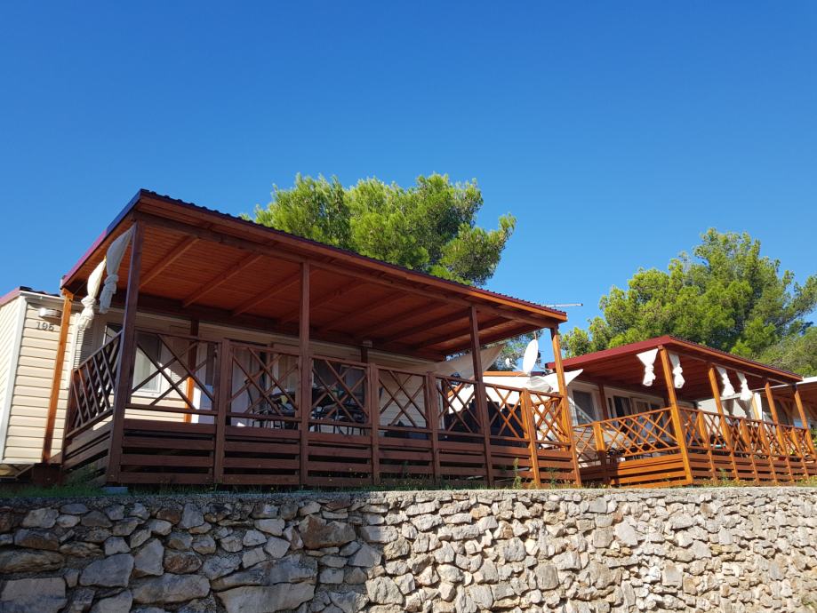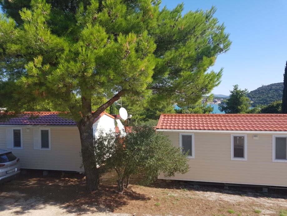 Prodaje se kompletno opremljena mobilna kućica Adria S line holiday Dalmacija 7,5 m x 4 m, s pripadajućom natkrivenom terasom 7 m x 3 m prikladna za smještaj do 6 osoba. Kućica je smještena u kampu Jezera Village (https://www.jezeravillage.com) na atraktivnoj parceli na kojoj je osigurano jedno parkirno mjesto. Udaljenost od mora je cca 200 m (drugi red mobilnih kućica). Kućica se sastoji od 2 spavaće sobe, 2 kupaonice (tuš+wc+ručnici), kuhinje s blagovaonicom, te velike natkrivene terase s pogledom na more. Spavaće sobe (jedna s bračnim krevetom, druga dva odvojena ležaja) opremljene su jastucima, prekrivačima te posteljinom, a kutna garnitura na razvlačenje za 2 osobe nalazi se u blagovaonici. Kuhinja je potpuno opremljena - štednjak s napom, pećnica, hladnjak sa zamrzivačem, mikrovalna pećnica, kuhalo za vodu, aparat za kavu, toster, pribor za jelo i kuhanje, šalice, čaše...U blagovaoni se nalazi i TV te klima uređaj. Na terasi su električni roštilj, stol i stolice, dvije ležaljke i stropni ventilator s osvjetljenjem. Okućnica je uređena bogatom hortikulturom s umjetnim navodnjavanjem.