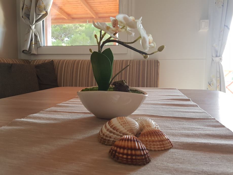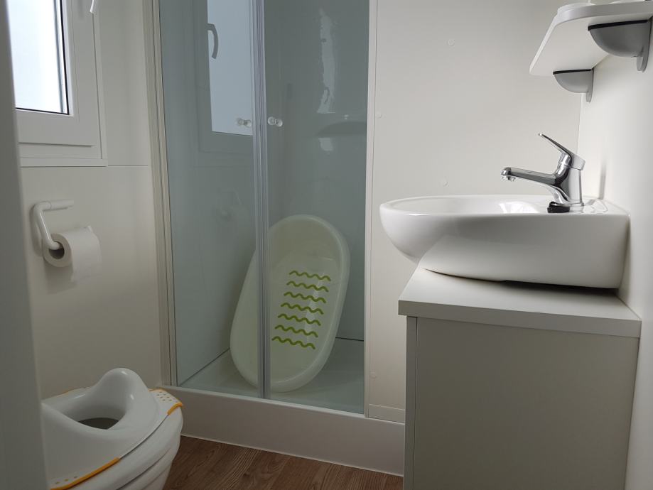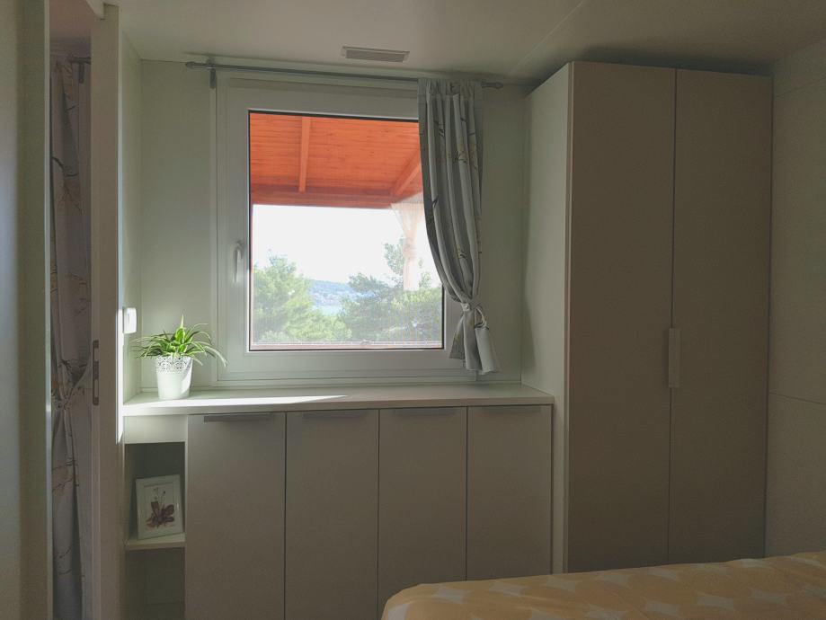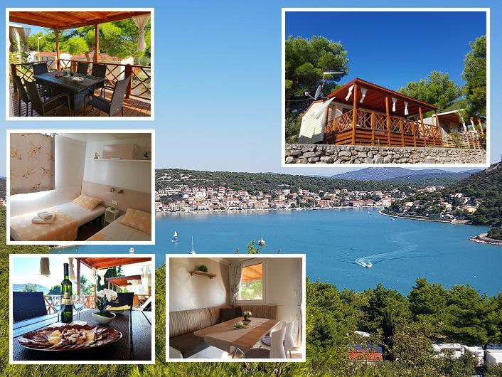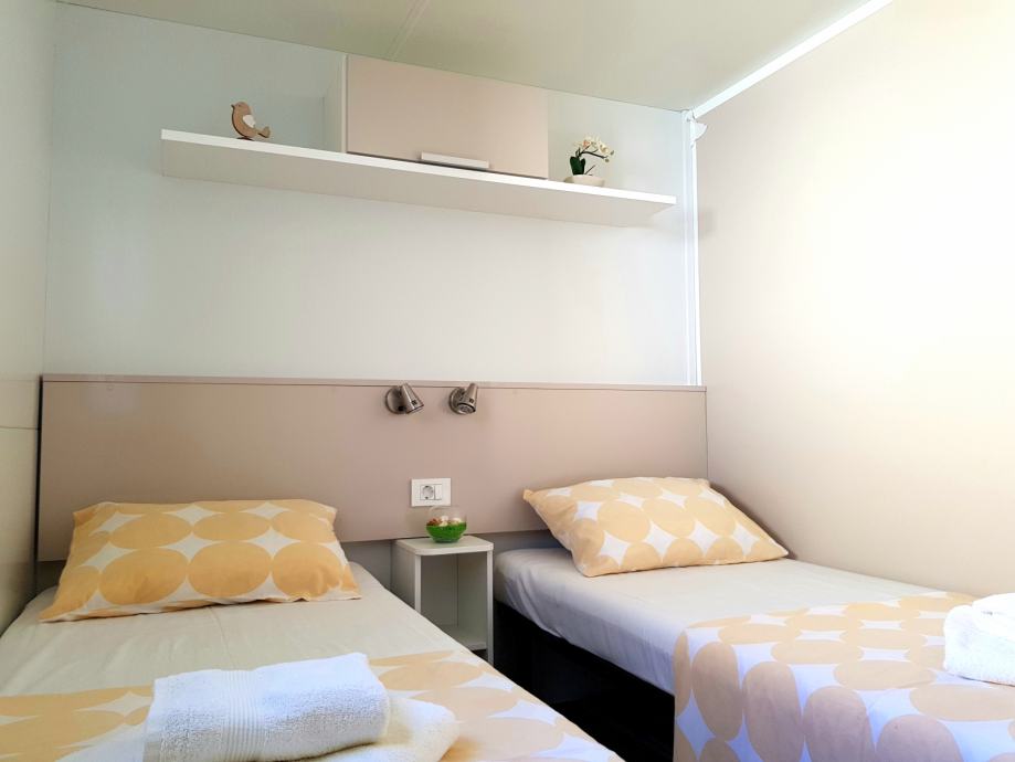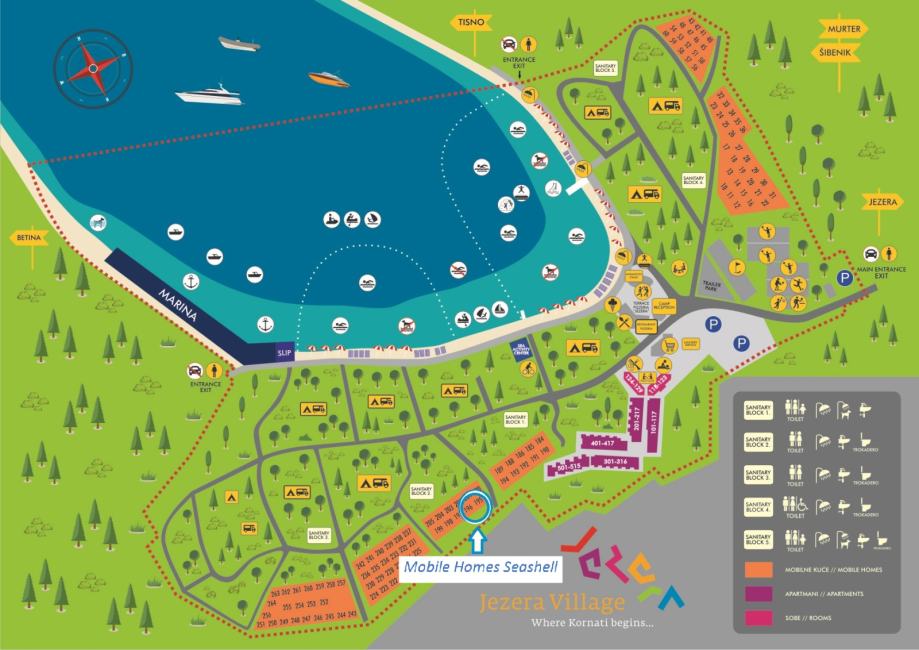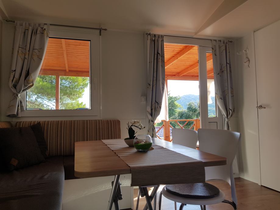 Prodaje se kompletno opremljena mobilna kućica Adria S line holiday Dalmacija 7,5 m x 4 m, s pripadajućom natkrivenom terasom 7 m x 3 m prikladna za smještaj do 6 osoba. Kućica je smještena u kampu Jezera Village (https://www.jezeravillage.com) na atraktivnoj parceli na kojoj je osigurano jedno parkirno mjesto. Udaljenost od mora je cca 200 m (drugi red mobilnih kućica). Kućica se sastoji od 2 spavaće sobe, 2 kupaonice (tuš+wc+ručnici), kuhinje s blagovaonicom, te velike natkrivene terase s pogledom na more. Spavaće sobe (jedna s bračnim krevetom, druga dva odvojena ležaja) opremljene su jastucima, prekrivačima te posteljinom, a kutna garnitura na razvlačenje za 2 osobe nalazi se u blagovaonici. Kuhinja je potpuno opremljena - štednjak s napom, pećnica, hladnjak sa zamrzivačem, mikrovalna pećnica, kuhalo za vodu, aparat za kavu, toster, pribor za jelo i kuhanje, šalice, čaše...U blagovaoni se nalazi i TV te klima uređaj. Na terasi su električni roštilj, stol i stolice, dvije ležaljke i stropni ventilator s osvjetljenjem. Okućnica je uređena bogatom hortikulturom s umjetnim navodnjavanjem.