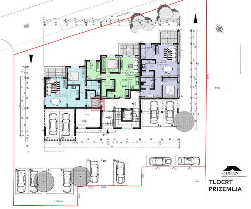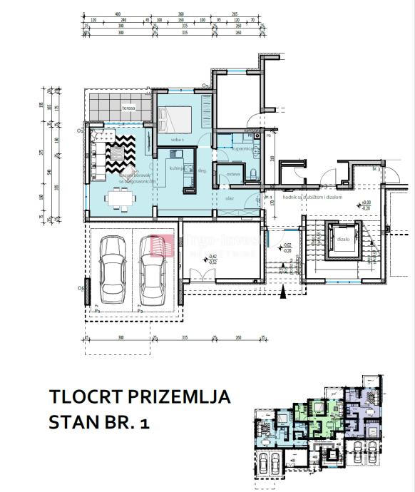 Stan S1 u prizemlju koji se sastoji od ulaza, hodnika, dnevnog boravka sa blagovaonicom, kuhinje, ostave, spavaće sobe, kupaonice, degažmana i terase stambene površine 60,37m2 + parking.