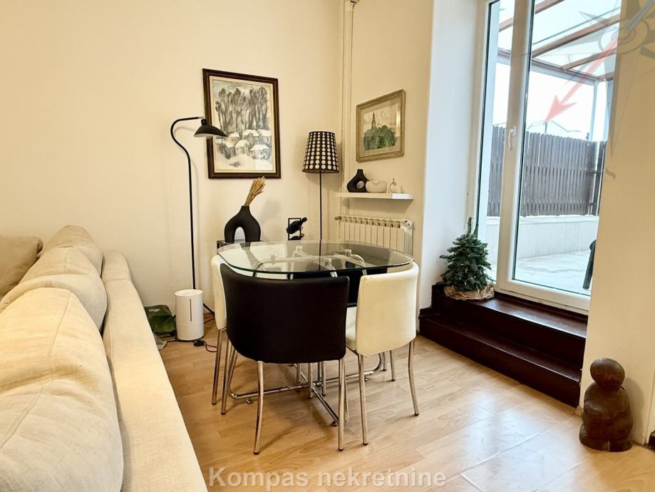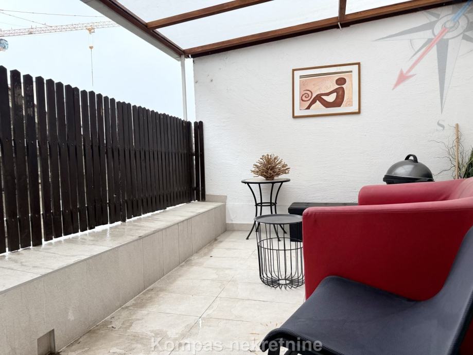 Dnevni boravak ima izlaz na obnovljenu, natkrivenu terasu od 12 m2 koji gleda na dvorišnu stranu.