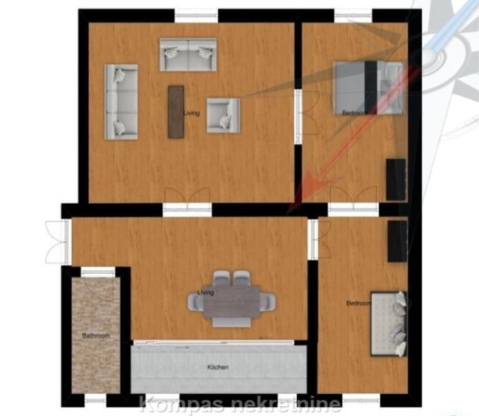 Sastoji se od kuhinje, dnevnog boravka, dvije spavaće sobe, kupaonice.