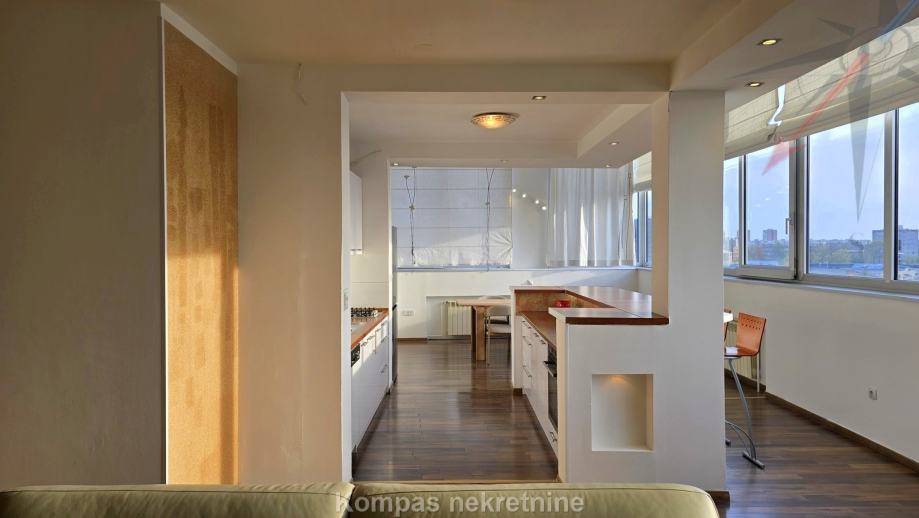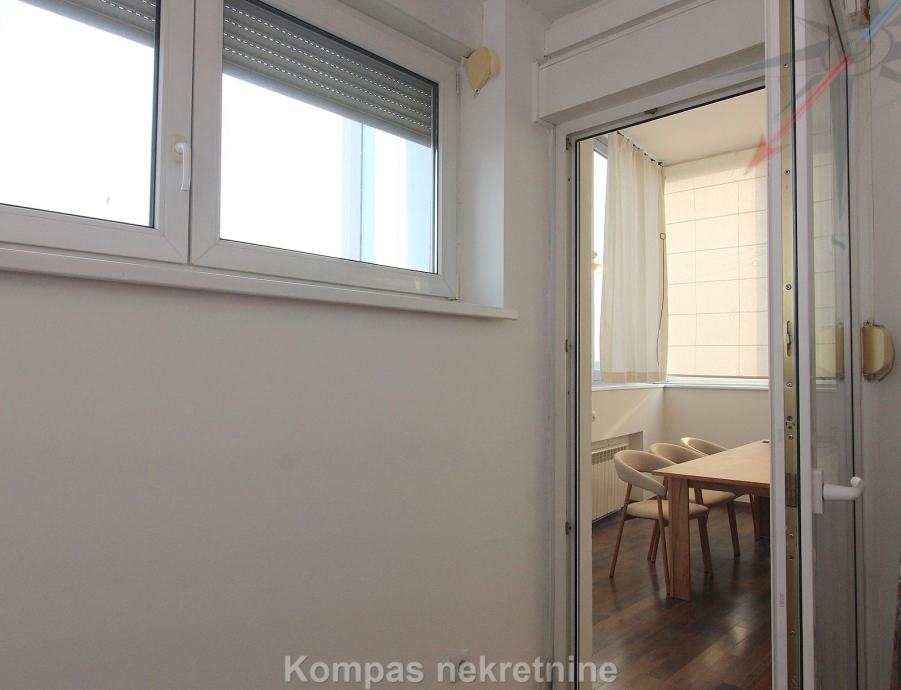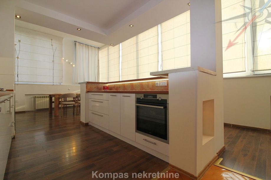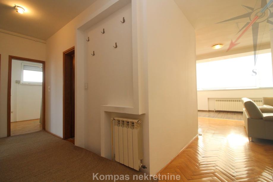 Djelomično namješten 4-soban stan od 100 m2 na petom katu stambeno poslovne zgrade s liftom, Zavrtnica. Sastoji se od ulaznog hodnika, kuhinje, četiri sobe od kojih su tri velike i jedna manja soba, kupaonice. Ima protuprovalna vrata, klima uređaj, mogućnost optičkog interneta, etažno plinsko grijanje, aluminijsku stolariju, staklene stijene koje omogućuju puno prirodnog svjetla. Stan se može dodatno isprazniti prema potrebama najmoprimca. Pripada mu spremište. Parkiranje je moguće na javnim parkiralištima uz povlaštenu parkirnu kartu za 1. zonu. Nalazi u blizini javnog prijevoza, autobusnog kolodvora i poslovne zone u Radničkoj cesti.