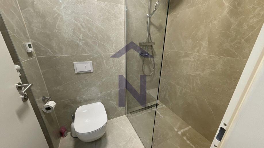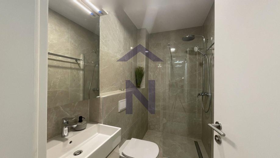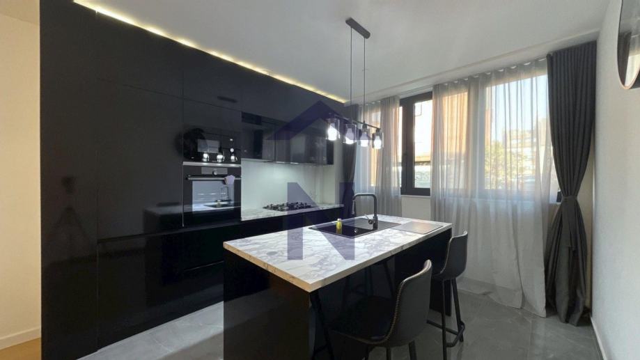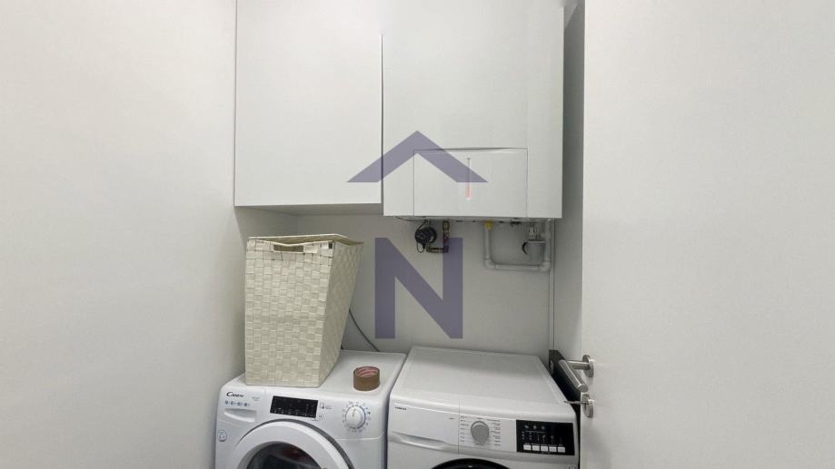 Opremljen je svim potrebnim aparatima - pećnica, perilica suđa, indukcijska ploča, hladnjak, perilica i sušilica rublja.