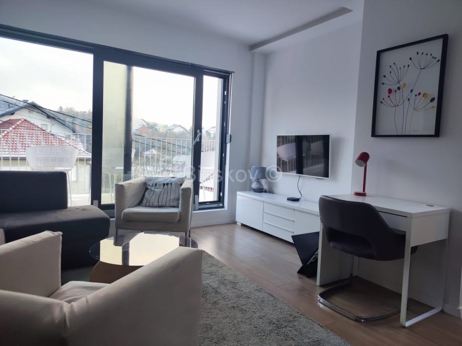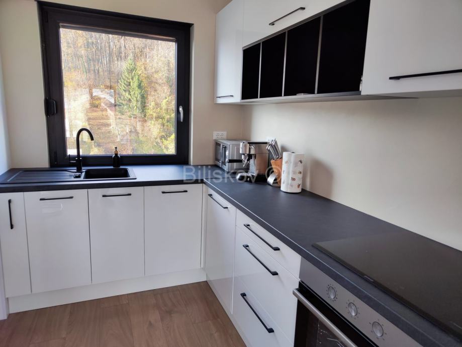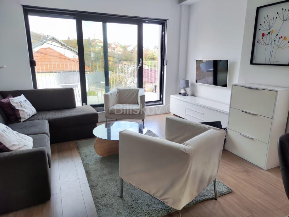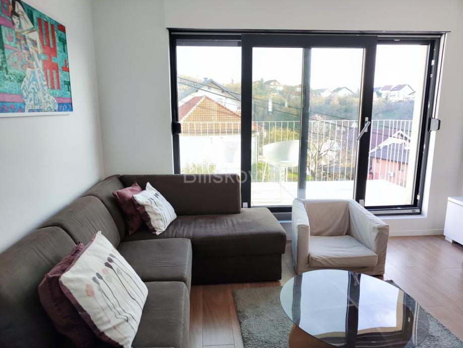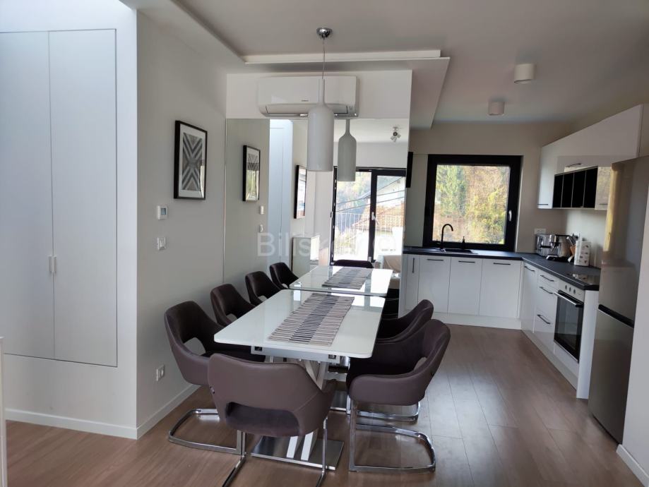 Stan se ističe panoramskim krovnim prozorima, kliznim stijenama, obiljem dnevnog svjetla i pogledom na zelenilo.