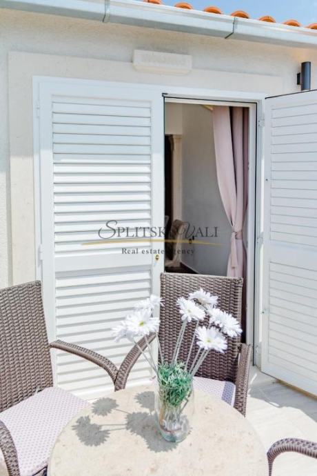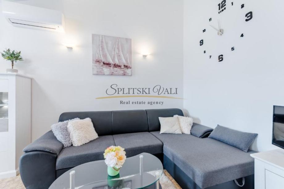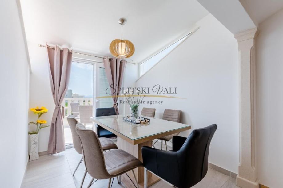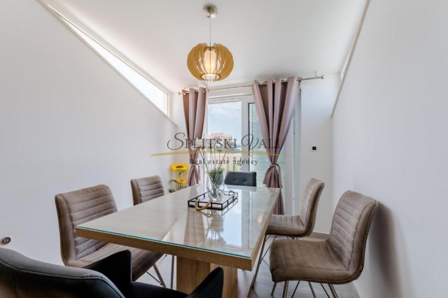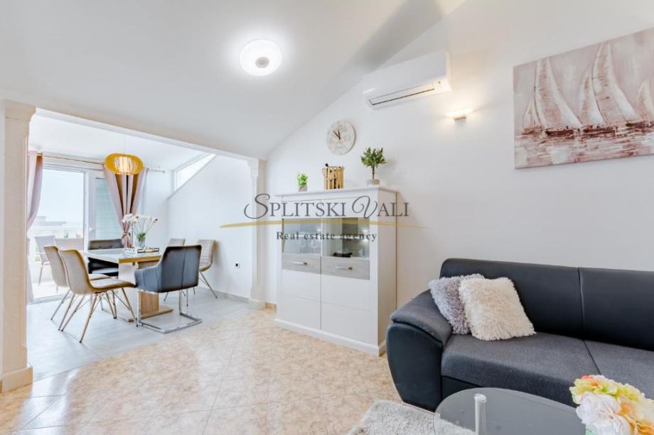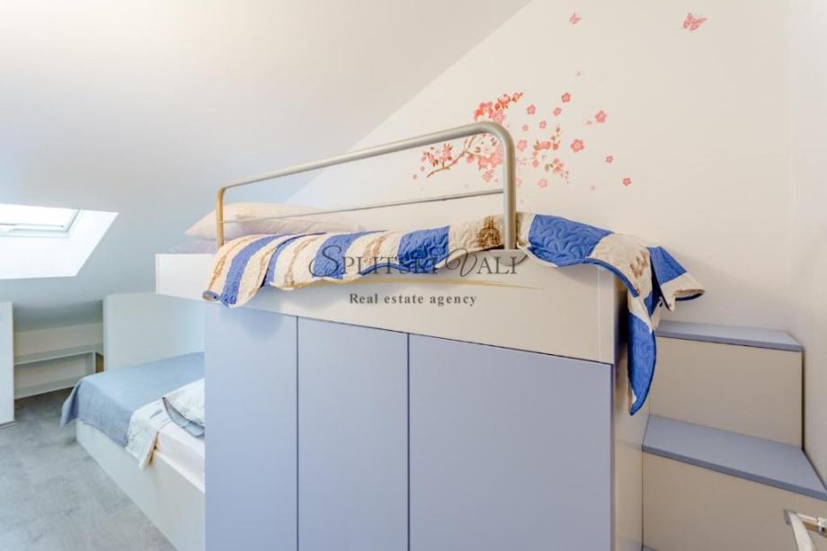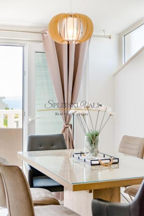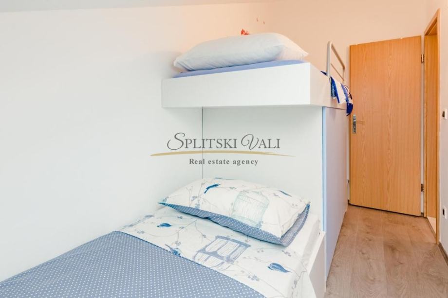 Osim dvije spavaće sobe, sastoji se od kuhinje s blagovaonicom i dnevnog boravka, kupaonice i balkona s pogledom na more te mu pripada jedno parkirno mjesto.