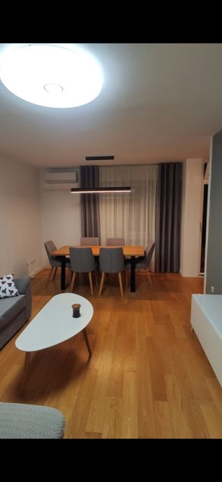 Stan je veličine 62,5 kvadrata. Velika kuhinja i dnevni boravak. Spavaća soba odvojena od dnevnog boravka. Četvrti kat bez lifta. Udaljenost 100m od glavnog ulaza u ŠRC Jarun. Javni parking ispred zgrade. Potpuno namješten. U prizemlju spremište za bicikl.