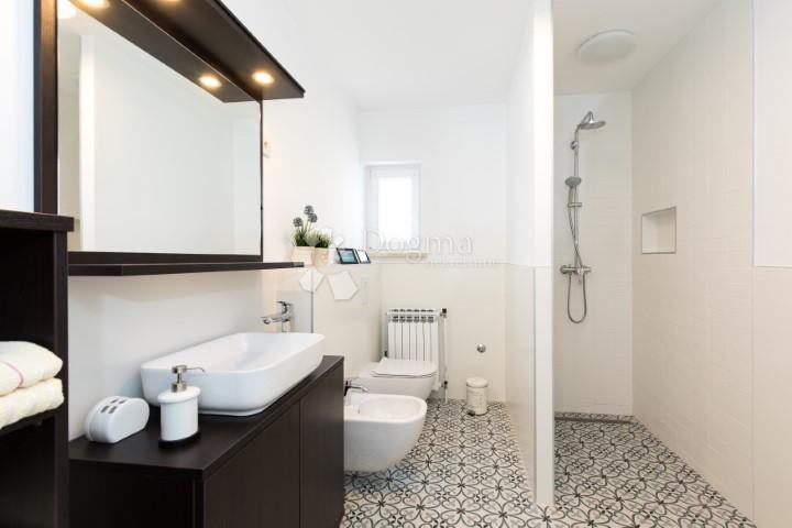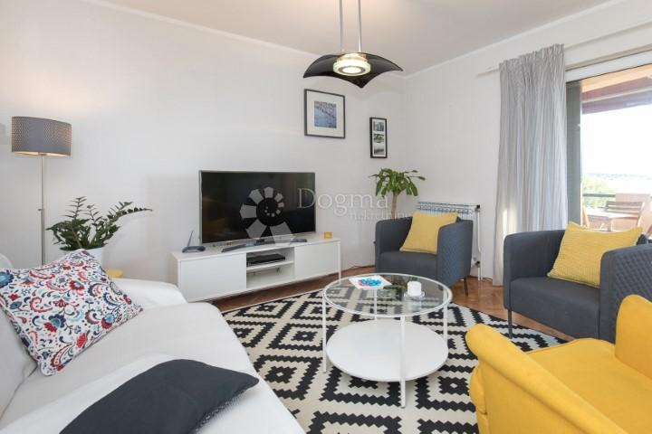 iznajmljujemo prekrasnu etažu, nekoliko metara udaljenu od mora. Površina etaže je 110 m2, a sastoji se od kuhinje, blagovaonice i dnevnog boravka, hodnika, kupaonice i tri dvokrevetne spavaće sobe. S velikog balkona puca otvoreni pogled na more za jutarnje uživanje u kavi i doručku. U najamninu je uključeno grijanje u zimskom periodu i topla voda tijekom cijele godine. Centar grada je udaljen desetak minuta ugodne šetnje, a javni parking nalazi se u neposrednoj blizini kuće.