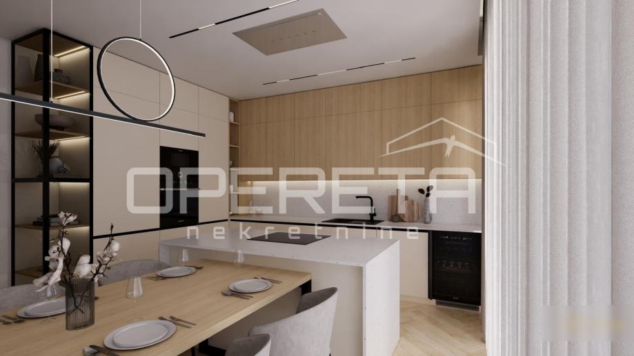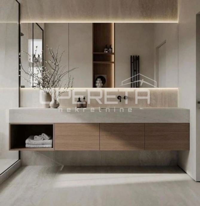 Kuća je opremljena podnim grijanjem, klimatizacijom, video nadzorom, alarmnim sustavom i pripremom za solarnu elektranu. Korišteni su visokokvalitetni materijali, a arhitektura kuće pruža izniman dojam privatnosti i elegancije.