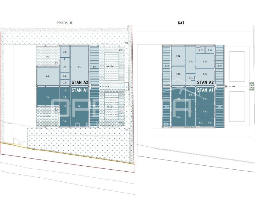 Površina kuće iznosi 233,32 m2, raspoređenih na dvije etaže. U prizemlju se nalazi dnevni boravak s blagovaonicom i kuhinjom, kupaonica, dodatni toalet, tehnička prostorija, ostava, natkrivena terasa, sunčalište i direktan izlaz na bazen. Tu je i zatvorena garaža s unutarnjim pristupom kući, kao i dodatno vanjsko parkirno mjesto.