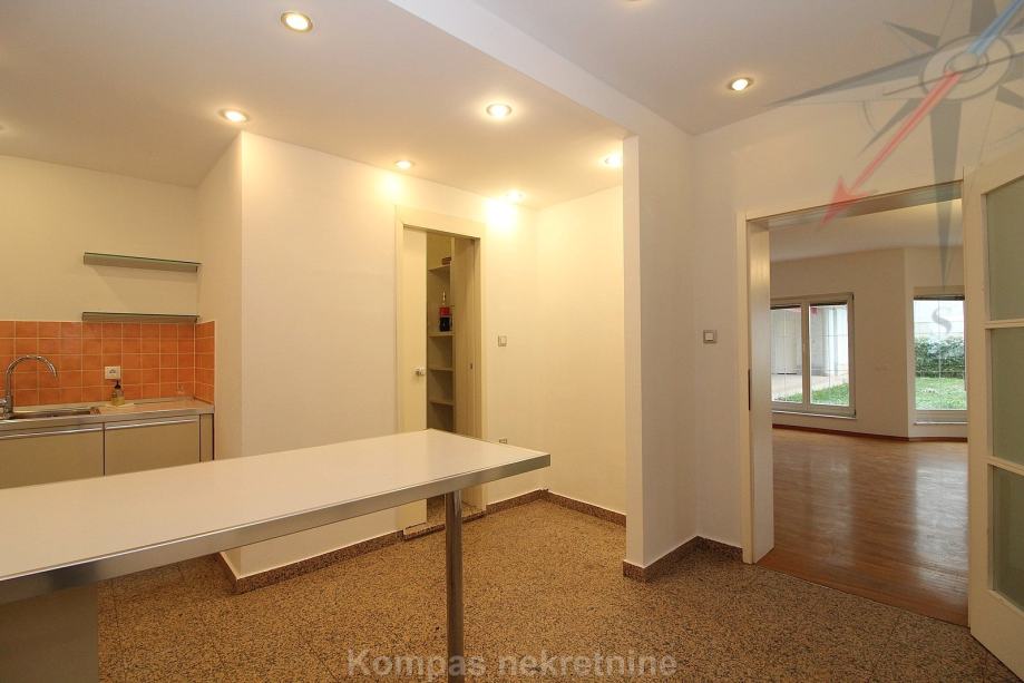 U prizemlju je opremljena kuhinja s ostavom, veliki dnevni boravak sa kaminom i izlazom na vrt, blagovaona i toalet.