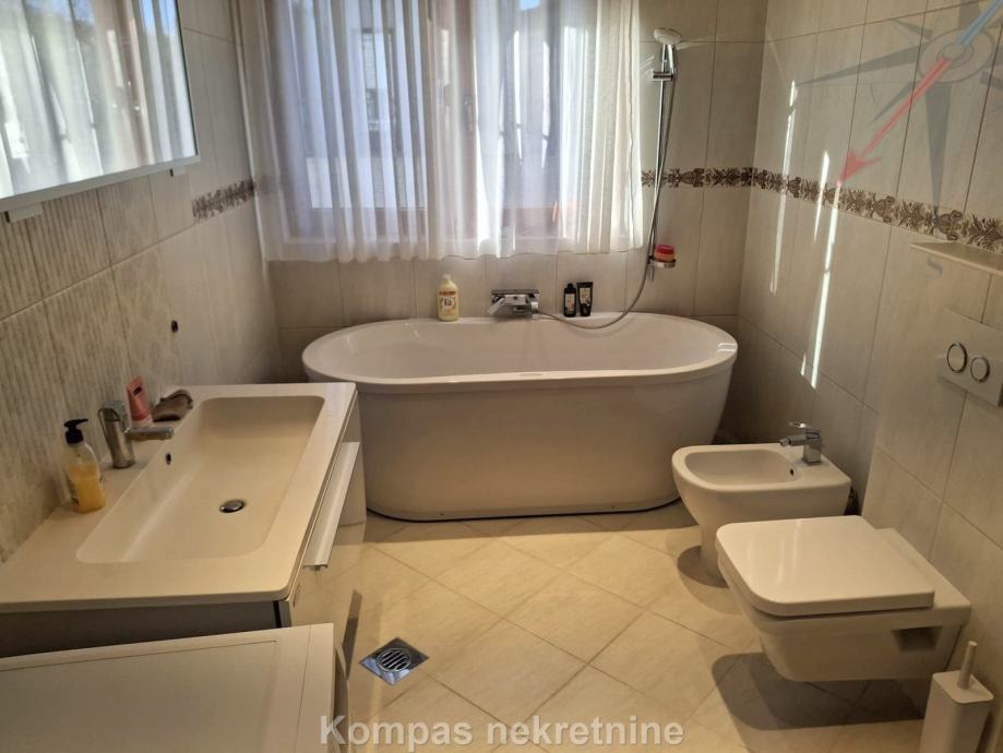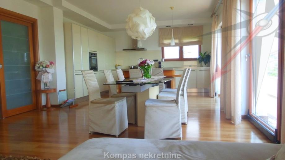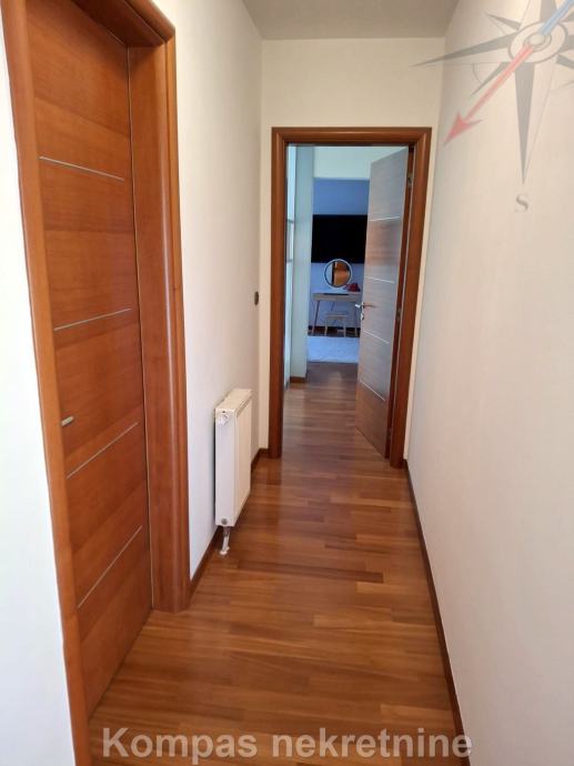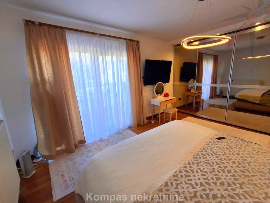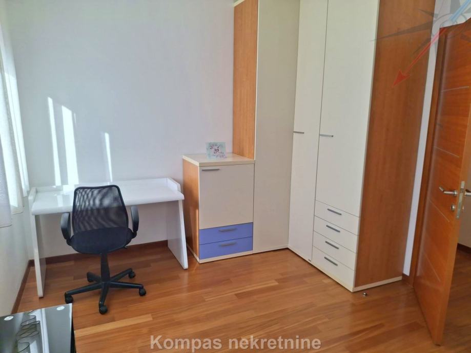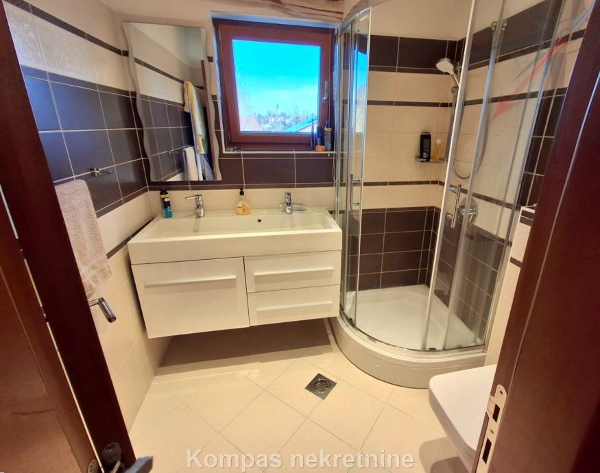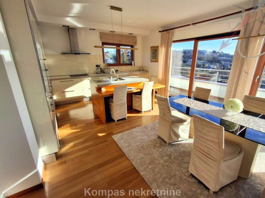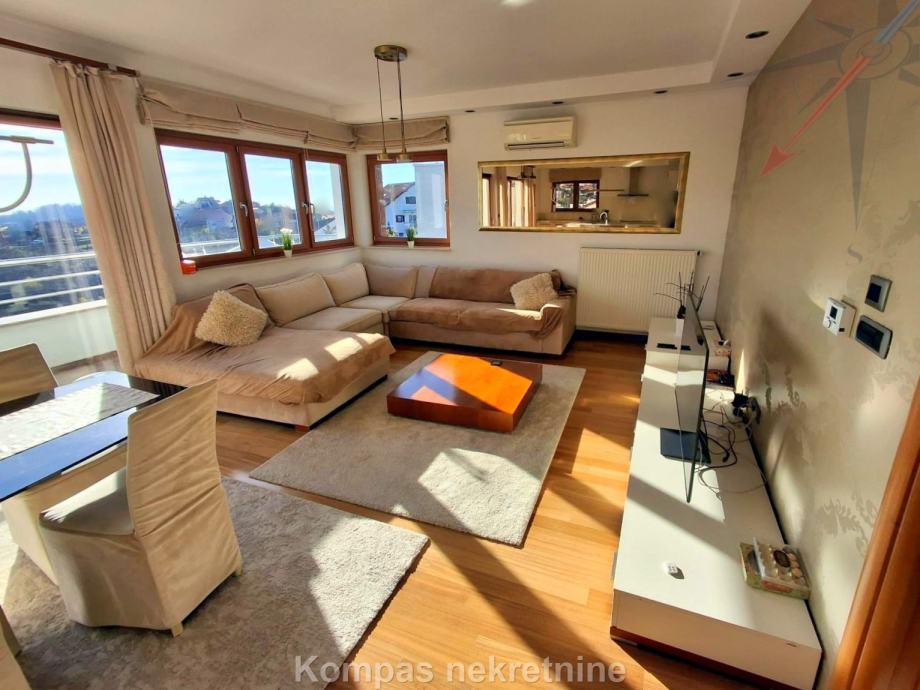 Modernly furnished 4-room penthouse (115 m2), Šestine. It consists of a large living room connected to the kitchen, three bedrooms, two bathrooms. The living room has a balcony on the south side, with a movable awning, two bedrooms have balconies.