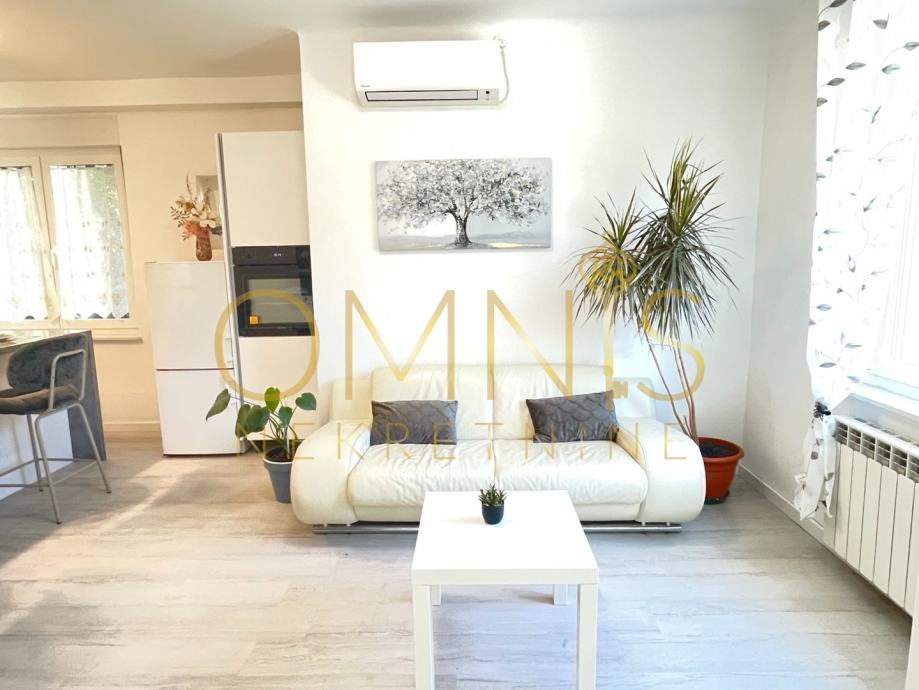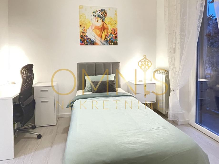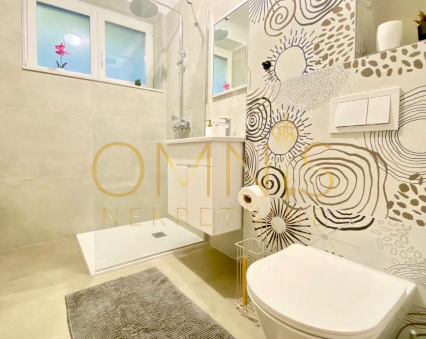 Prostor se sastoji od svijetlog dnevnog boravka povezanog s potpuno opremljenom kuhinjom i blagovaonicom u skladnu i modernu cjelinu, dviju spavaćih soba od kojih je jedna opremljena bračnim krevetom, dok druga ima izlaz na balkon. Obje sobe imaju velike ugradbene ormare i radne stolove, što stan čini pogodnim i za rad od kuće. Kupaonica je opremljena novim sanitarijama i modernim “walk-in” tušem, a grijanje je riješeno putem centralnog sustava uz dodatnu klimatizaciju, što osigurava ugodnu temperaturu tijekom cijele godine.