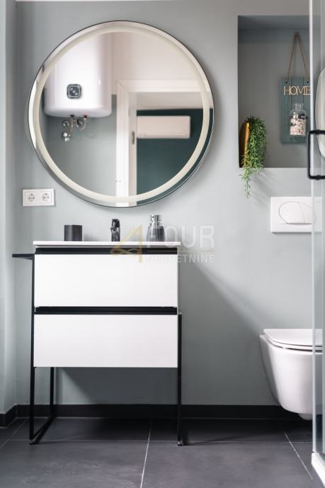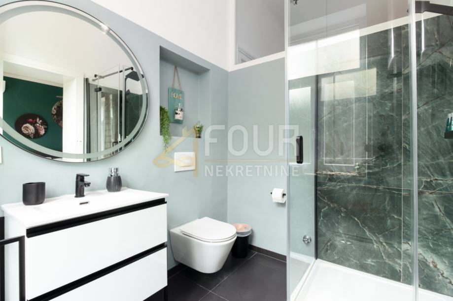 Adaptirana je i svaka kupaonica, a stan je opremljen modernim sustavom podnog grijanja i klima uređajem. Dodatno, stan je opremljen PVC stolarijom, protuprovalnim vratima.