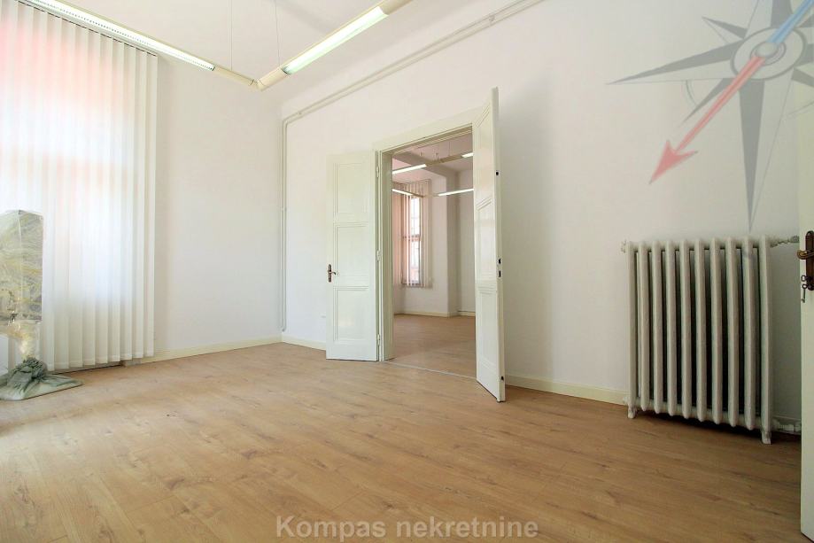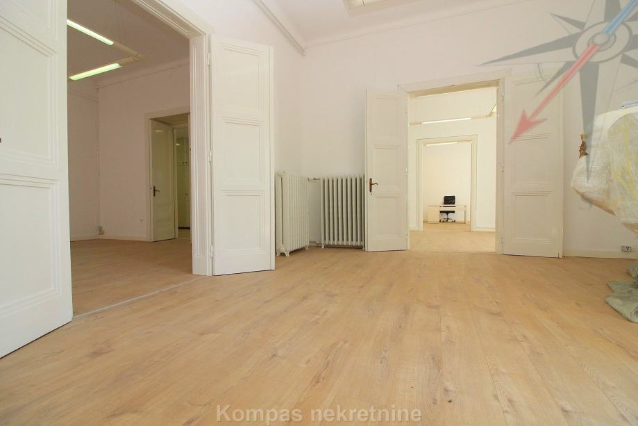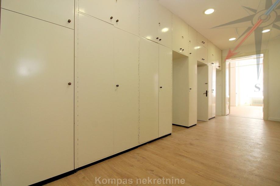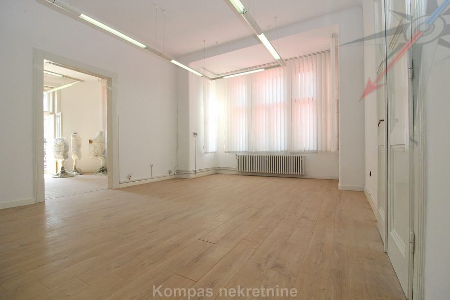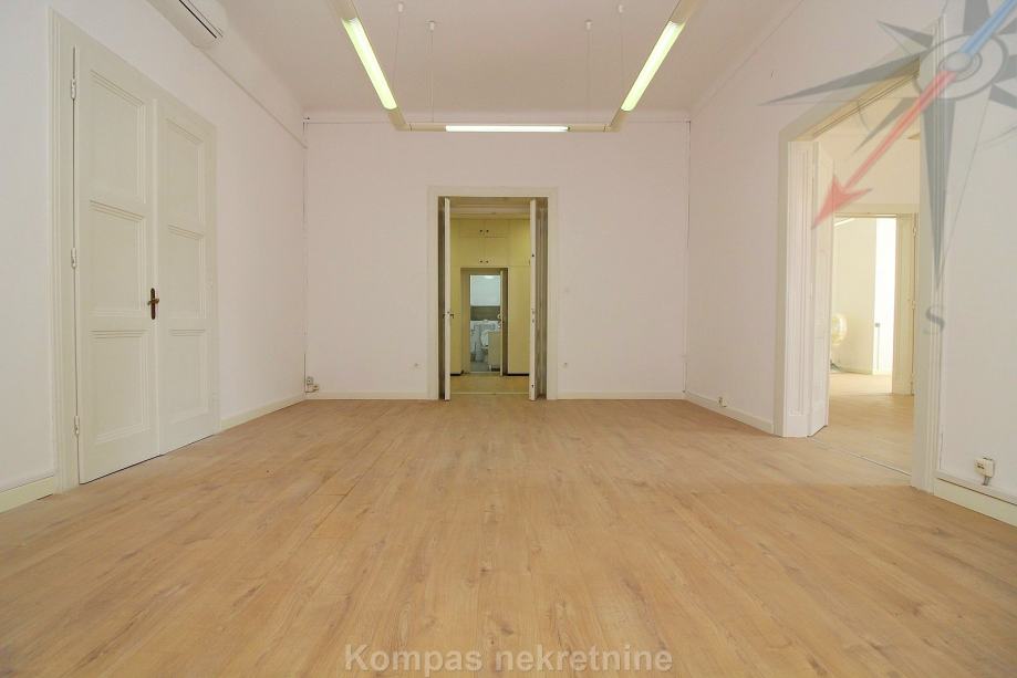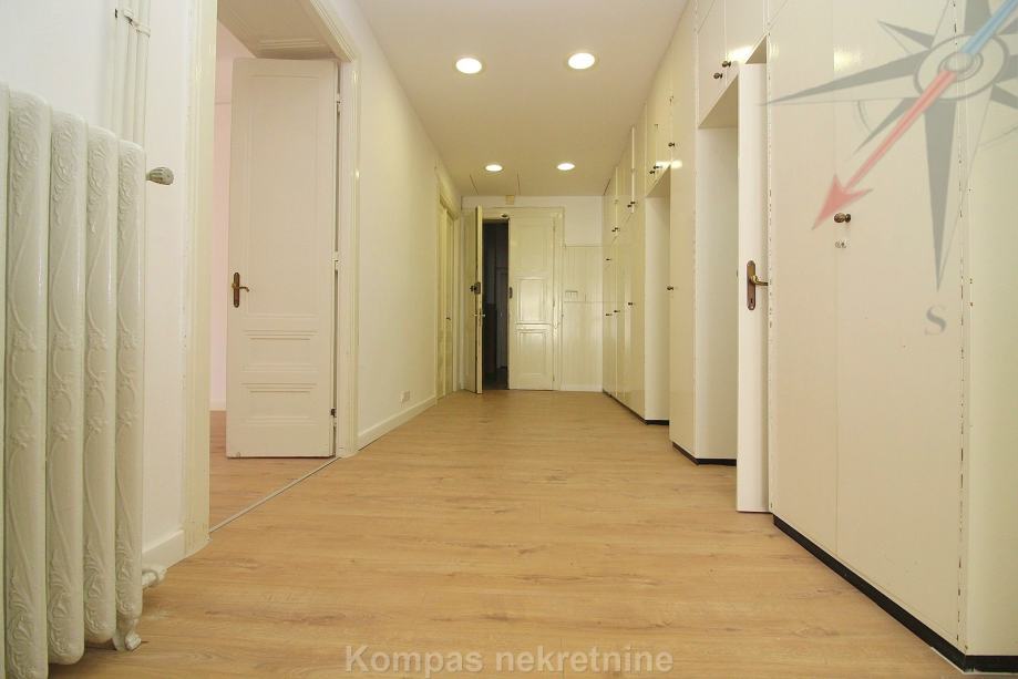 Unfurnished 5-room apartment (180 m2) on the first floor of a residential building, Trg bana Jelačića. It consists of an entrance area with built-in wardrobes, kitchenette, five rooms, bathroom, toilet, balcony, storage in the basement. It has security doors, intercom, optical Internet, air conditioning, gas heating, IT network. The apartment is located in the immediate vicinity of public transport and all facilities of the strict city center.