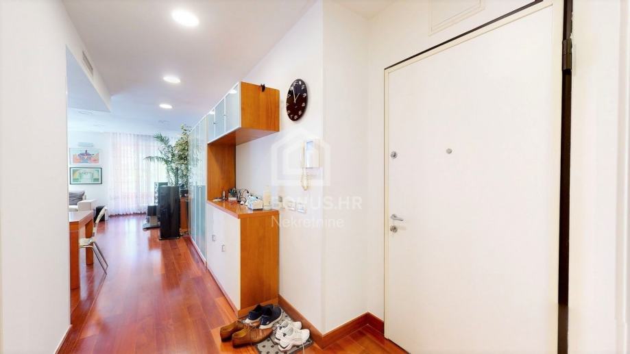 Stan se nalazi na 1. katu s liftom, u novijoj zgradi izgrađenoj 2006. godine. Ukupna površina stana iznosi 100,84 m2, od čega je zatvorena stambena površina 88,12 m2 + loggia 9,88 m2 + spremište 2,84 m2 + garaža 15,26 m2.