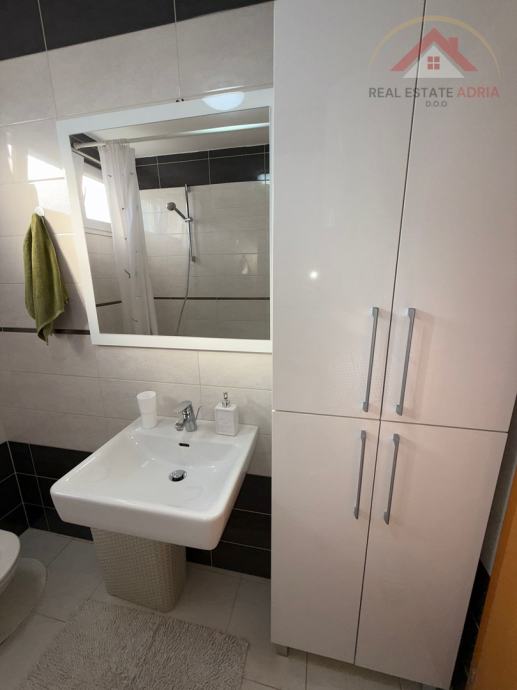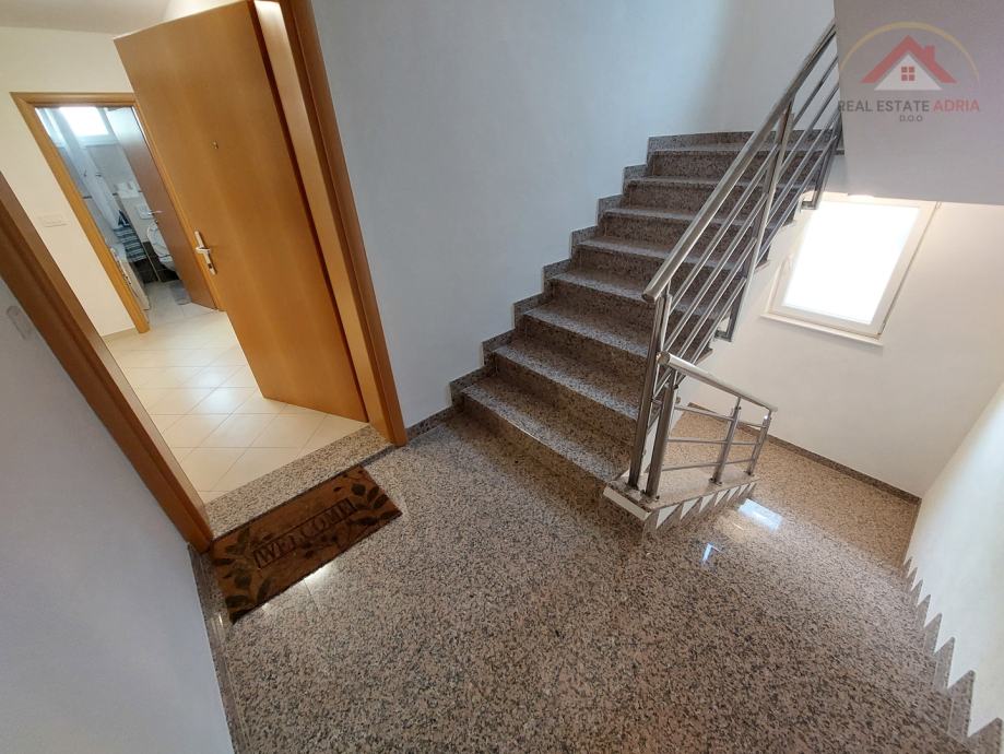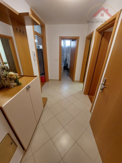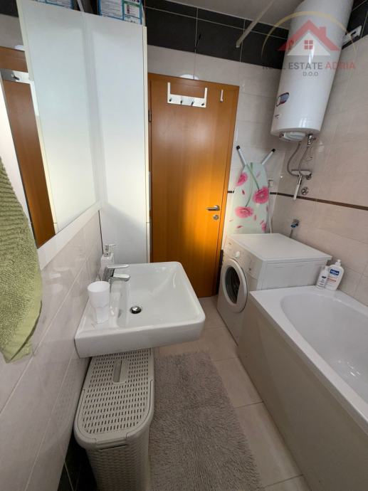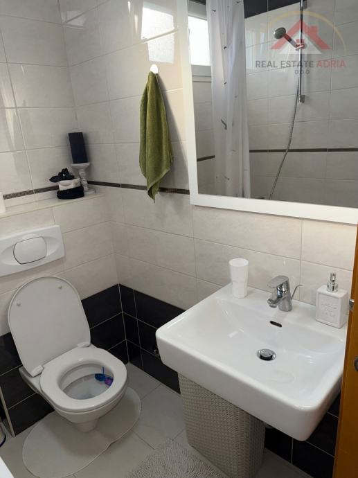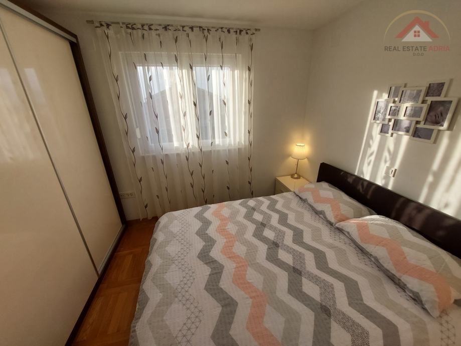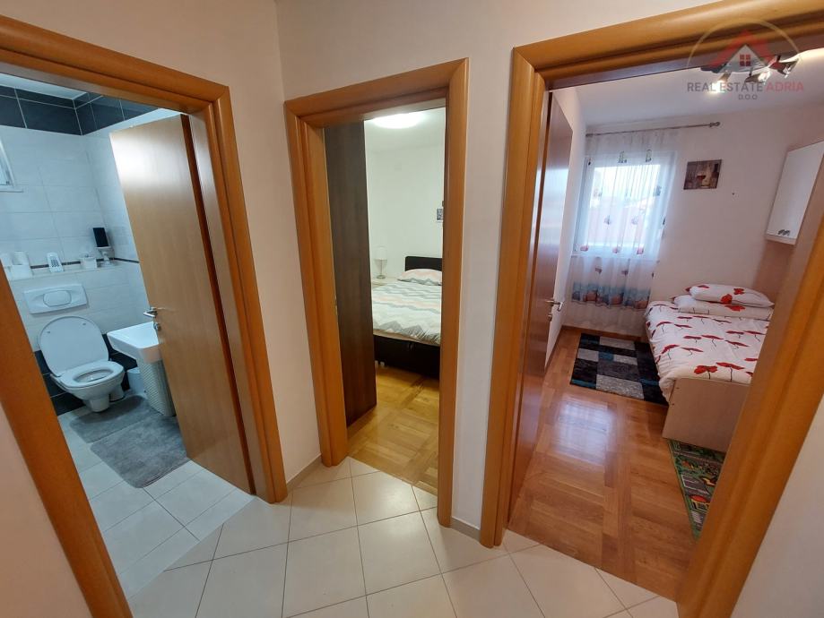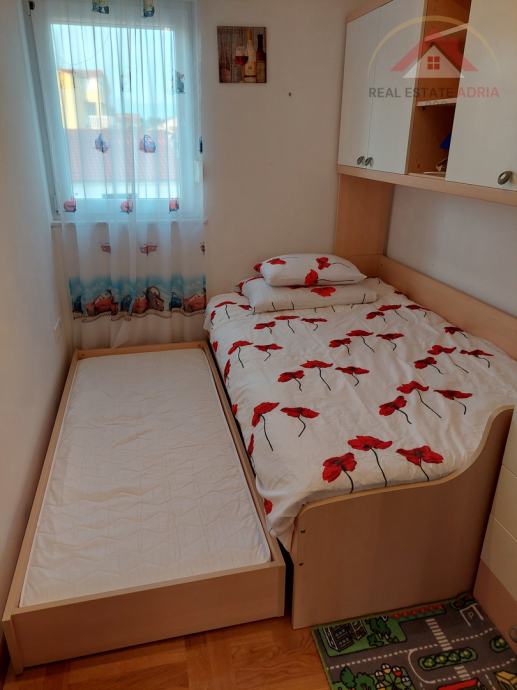 parkirnog mjesta br. 1. Parking ima i za dva auta, motor, bicikle, kolica sve. Dvorište je lijepo ograđeno samo za stanare, a ulazna vrata su uvijek zaključana. Zgrada je vrlo uredna i tiha te ima samo 4 stanara. Stan je orijentiran na zapad. samo stan ima bruto bruto površinu od 52 m2 ali vrlo dobro iskorišten prostor. Idealno za do tri osobe, ako je za život tijekom cijele godine. Ako je na 6 mjeseci za turističku sezonu onda može i do 6 osoba boraviti istovremeno. Spavaća soba bračni krevet, dječja soba dva ležaja, jedan je na izvlačenje i kutna garnitura na razvlačenje. Udaljenost od mora, plaže i centra sve do 1 km pješice.