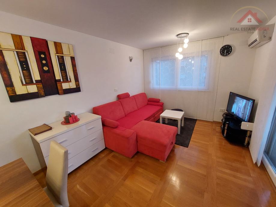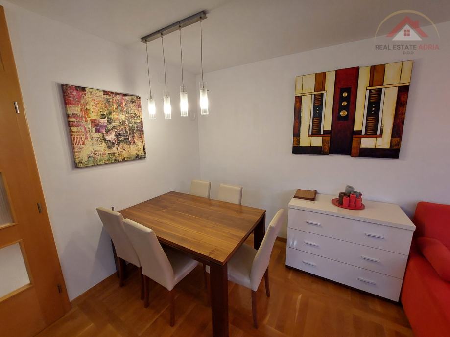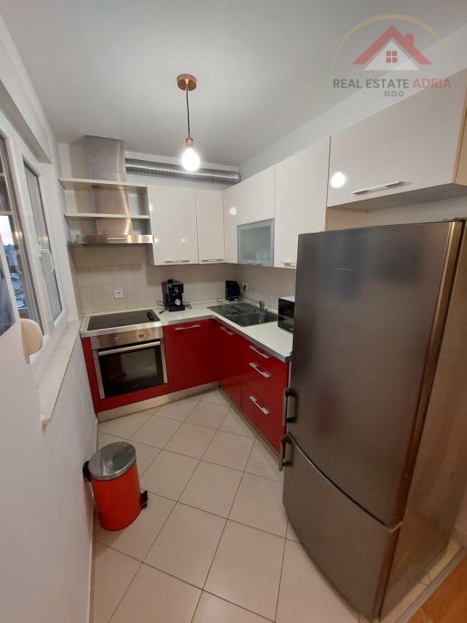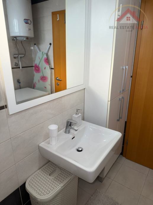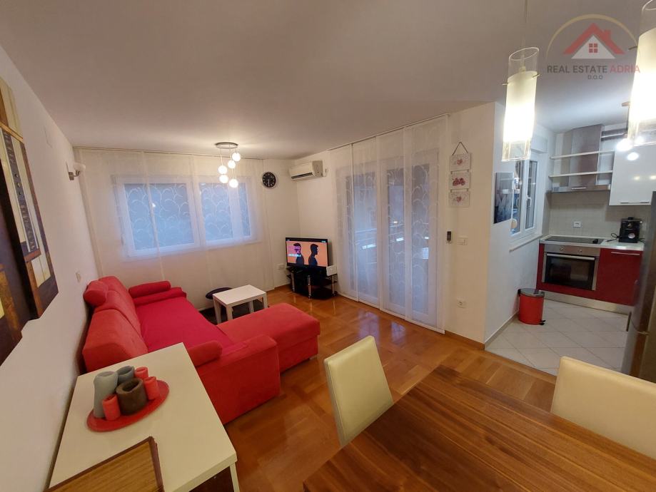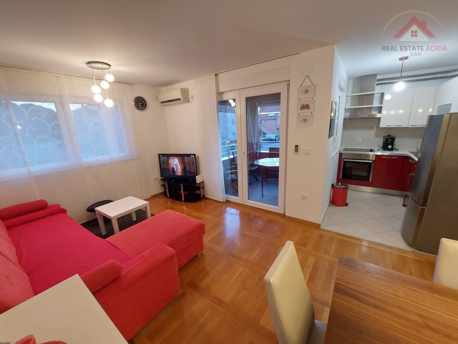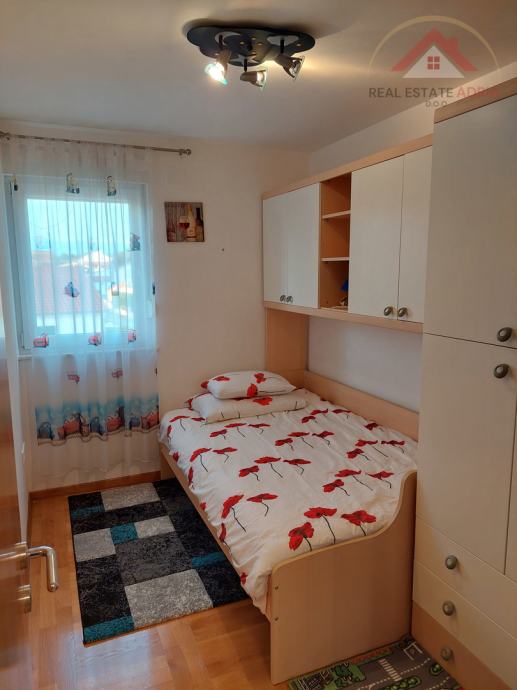 parkirnog mjesta br. 1. Parking ima i za dva auta, motor, bicikle, kolica sve. Dvorište je lijepo ograđeno samo za stanare, a ulazna vrata su uvijek zaključana. Zgrada je vrlo uredna i tiha te ima samo 4 stanara. Stan je orijentiran na zapad. samo stan ima bruto bruto površinu od 52 m2 ali vrlo dobro iskorišten prostor. Idealno za do tri osobe, ako je za život tijekom cijele godine. Ako je na 6 mjeseci za turističku sezonu onda može i do 6 osoba boraviti istovremeno. Spavaća soba bračni krevet, dječja soba dva ležaja, jedan je na izvlačenje i kutna garnitura na razvlačenje. Udaljenost od mora, plaže i centra sve do 1 km pješice.