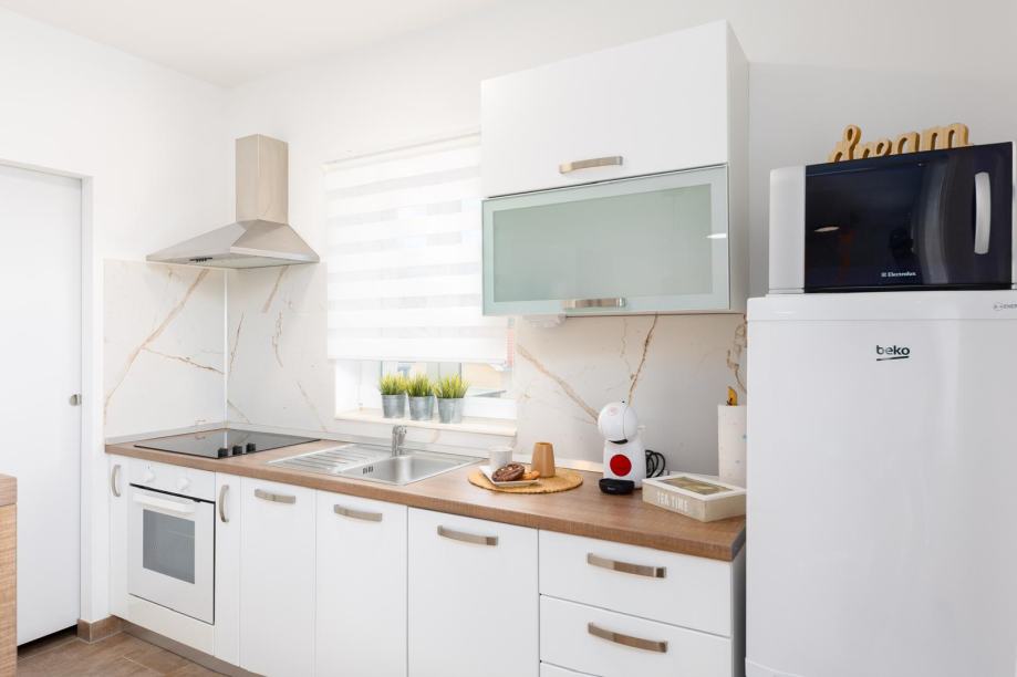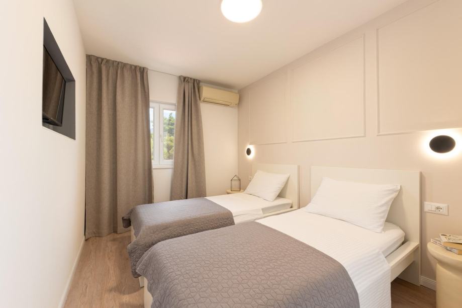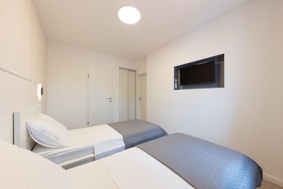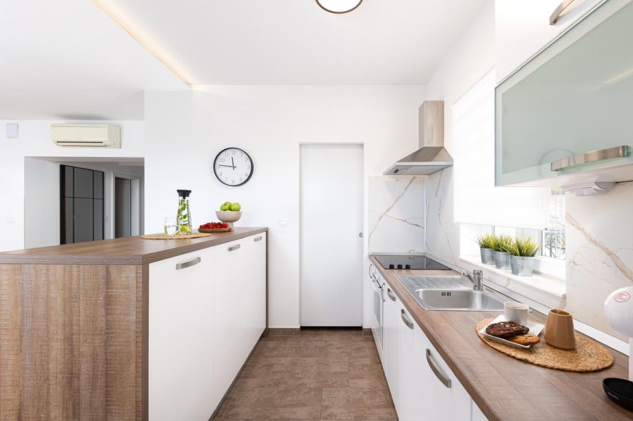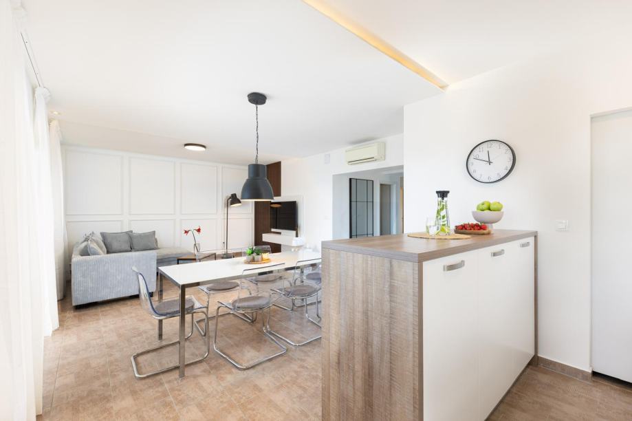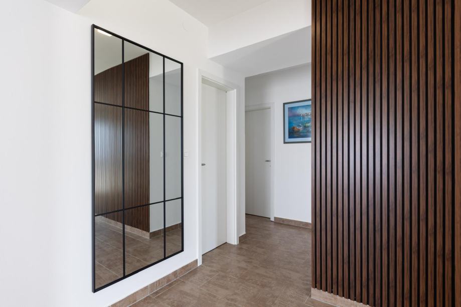 Prostire se na 120m2 površine i sastoji od kuhinje, blagovaonice i dnevnog boravka s izlazom na terasu, 3 spavaće sobe s 3 kupaonice, zasebnog malog wc-a te ulaznog dijela (hodnika).