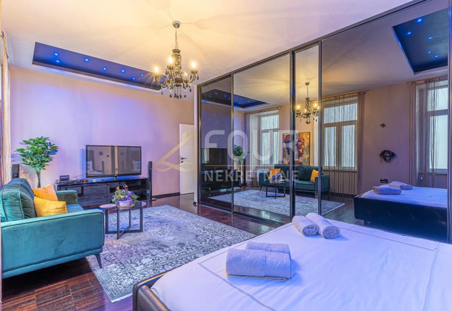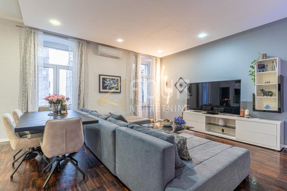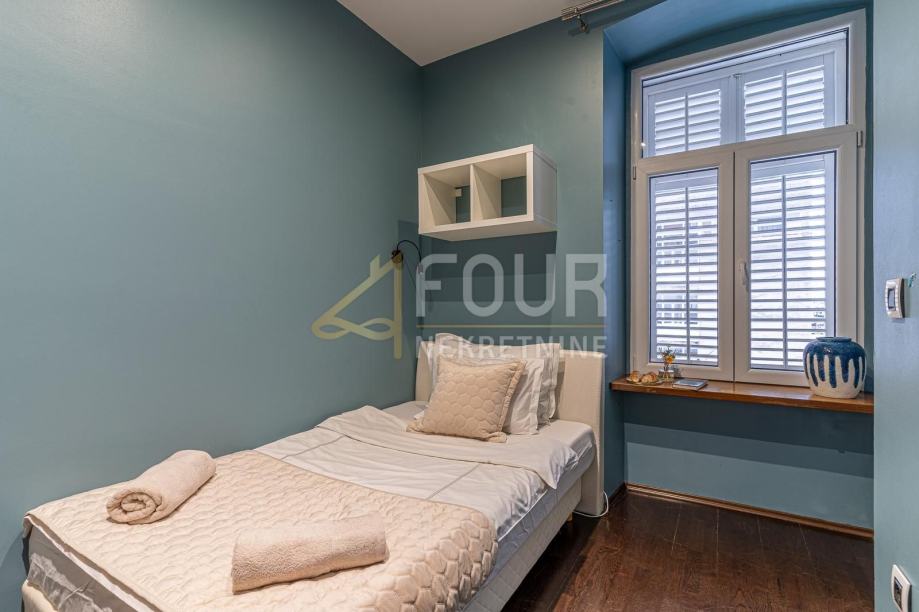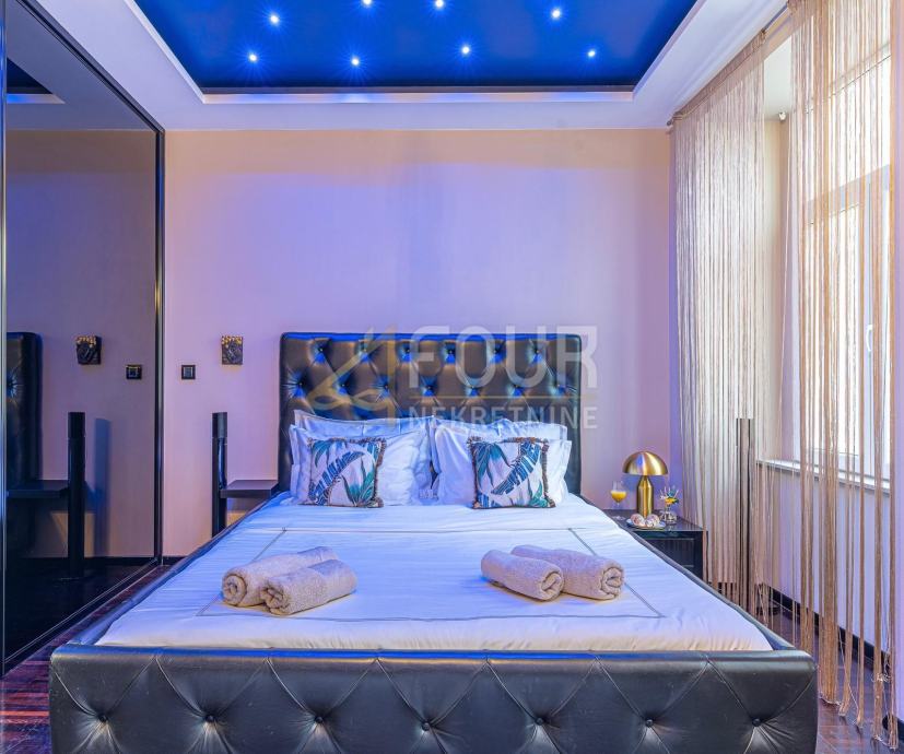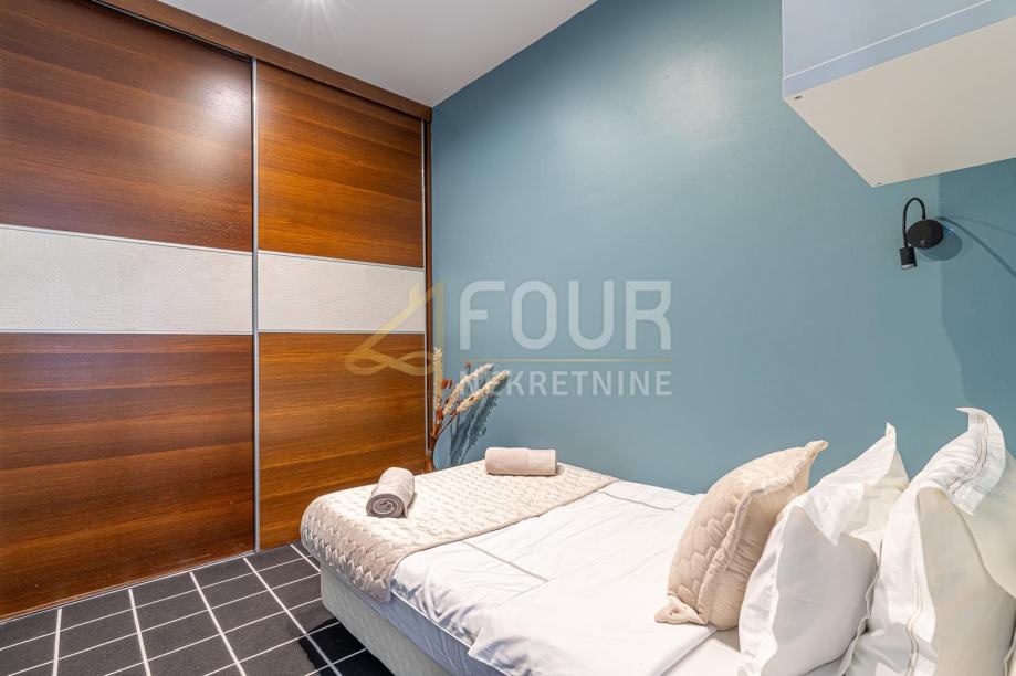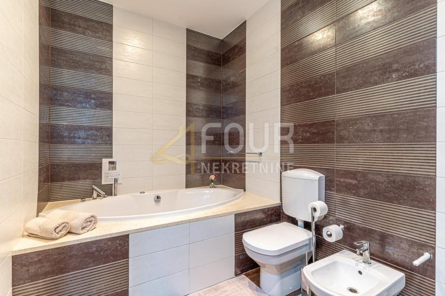 Posebnost stana je master spavaća soba površine oko 30 m2, koja dolazi s privatnom kupaonicom opremljenom masažnom kadom – idealno za opuštanje nakon dugog dana. Druga kupaonica nudi dodatnu praktičnost, a stan je u potpunosti namješten i opremljen vrhunskom bijelom tehnikom. Uključuje dvije televizije, perilicu i sušilicu rublja, perilicu posuđa, indukcijsku ploču, napu, pećnicu i frižider, pružajući maksimalnu funkcionalnost i stil. Stan je klimatiziran.