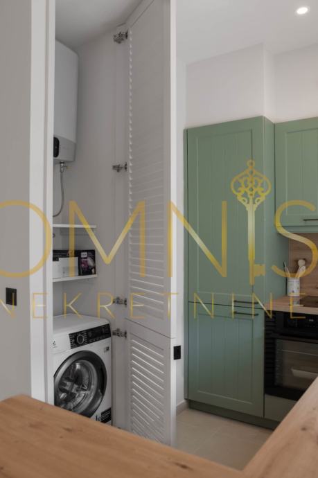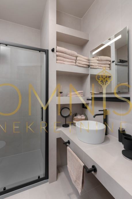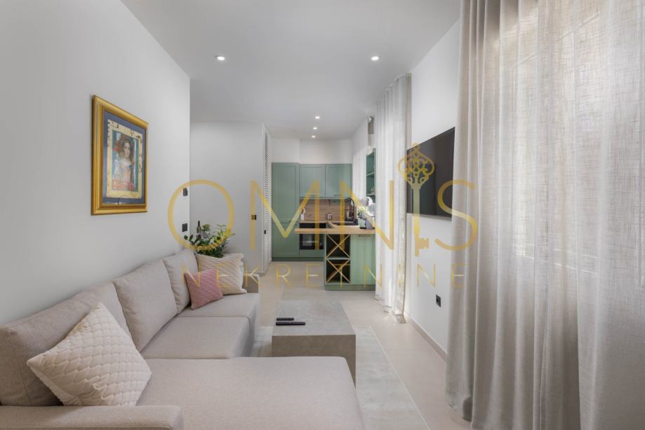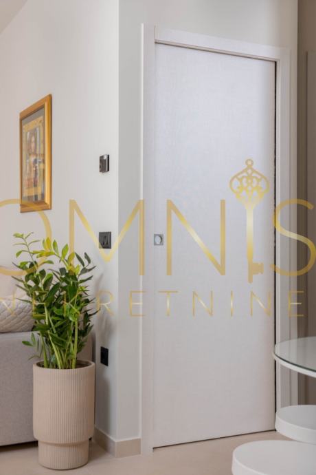 Unutrašnjost stana odlikuje se svijetlim i skladno uređenim dnevnim boravkom koji je povezan s modernom kuhinjom i blagovaonskim dijelom. Kuhinja je u potpunosti opremljena svim potrebnim aparatima, uključujući i male kućanske uređaje te posuđe. Spavaća soba pruža udobnost zahvaljujući kvalitetnom krevetu, velikim ormarima i radnim prostorom, dok je kupaonica uređena u elegantnom tonu i opremljena walk-in tušem i modernom armaturom.