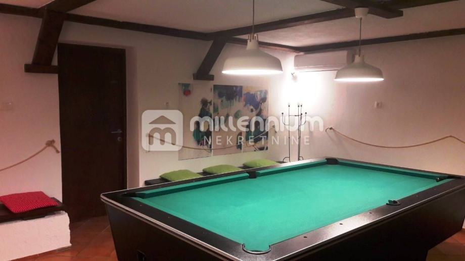 U prizemlju su smještene kuhinja, blagovaonica, dnevni boravak i prostorija za druženje s biljarskim stolom.