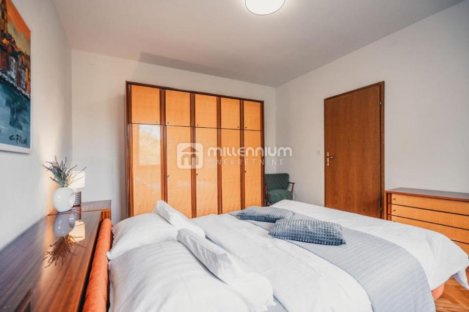 Iznajmljuje se namještena kuća koja se sastoji od prizemlja i kata ukupne površine 151.08m2, pripadajuće ograđene okućnice od cca 500m2 i natkrivene terase.