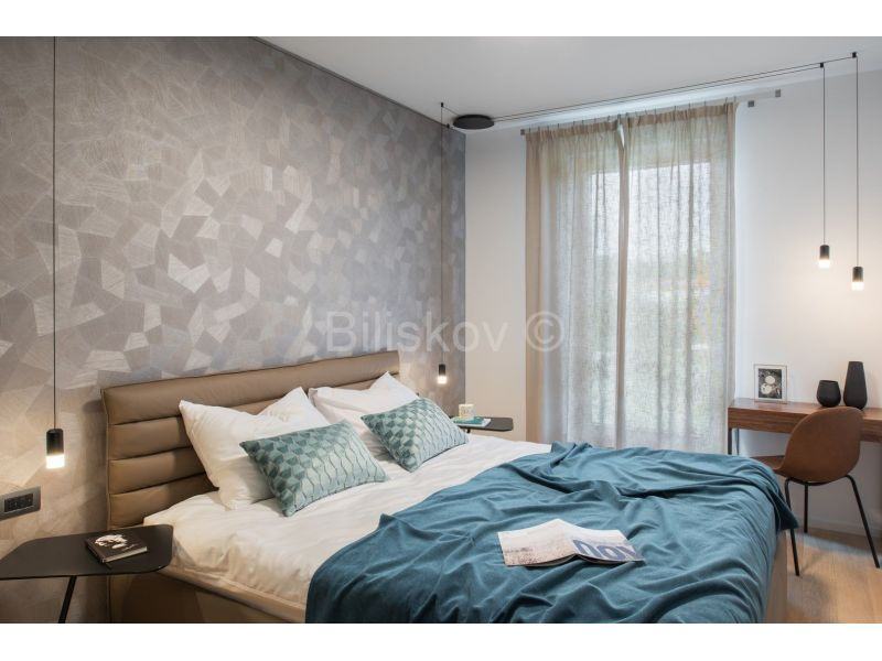 Stan ukupno korisne površine 140m2 s osigurana dva parkirna mjesta. Sastoji se od kuhinje s trpezarijom i dnevnim boravkom, tri spavaće sobe, tri kupatila-od kojih je jedno u sklopu spavaće sobe i velikom terasom s otvorenim pogledom. Stan je vrhunski opremljen te upravljan sustavom pametnog stana-Control-4: u stan se ulazi otiskom prsta, klimatizacijom-Daikin se upravlja mobitelom, podno grijanje-Daikin, najkvalitetnija keramika i parketa, prozori od drva i aluminija s trostrukim staklom..... U prizemlju zgrade smješten je otvoreni bazen, teretana, sauna, jacuzzi, stolovi za masažu....