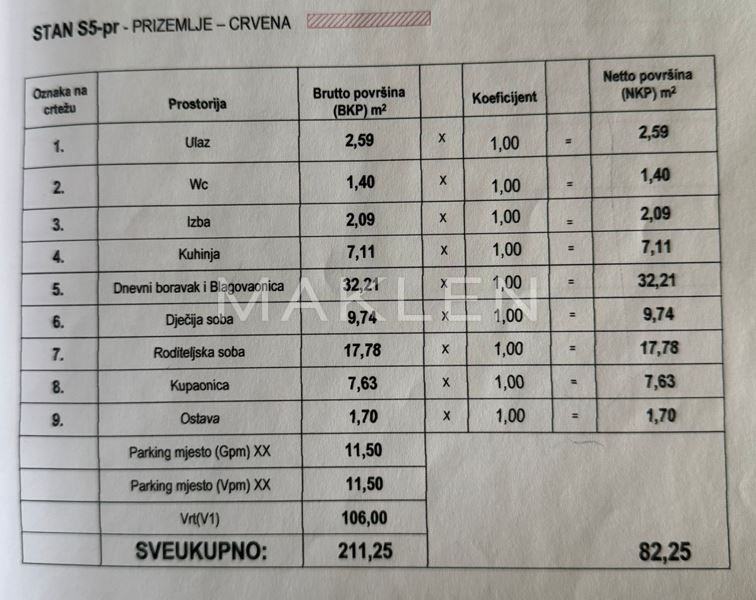 Stanu također pripadaju i dva vanjska parkirna mjesta, nenatkriveno (NKP 3,45 m2), natkriveno (NKP 5,75 m2) te vrt od 106 m2 (NKP 10,6 m2).