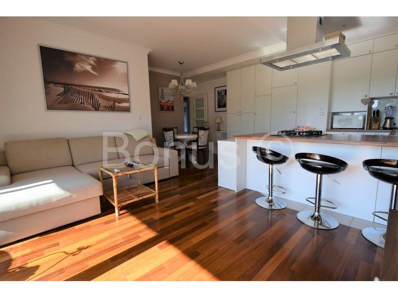 The apartment has a surface area of 60 m² and consists of a living room with a dining area and kitchen, which open onto a balcony (facing the eastern side of the city), two bedrooms, a bathroom, a hallway, and a storage room in the basement of approximately 8 m². The apartment includes one parking space in the courtyard in front of the building.