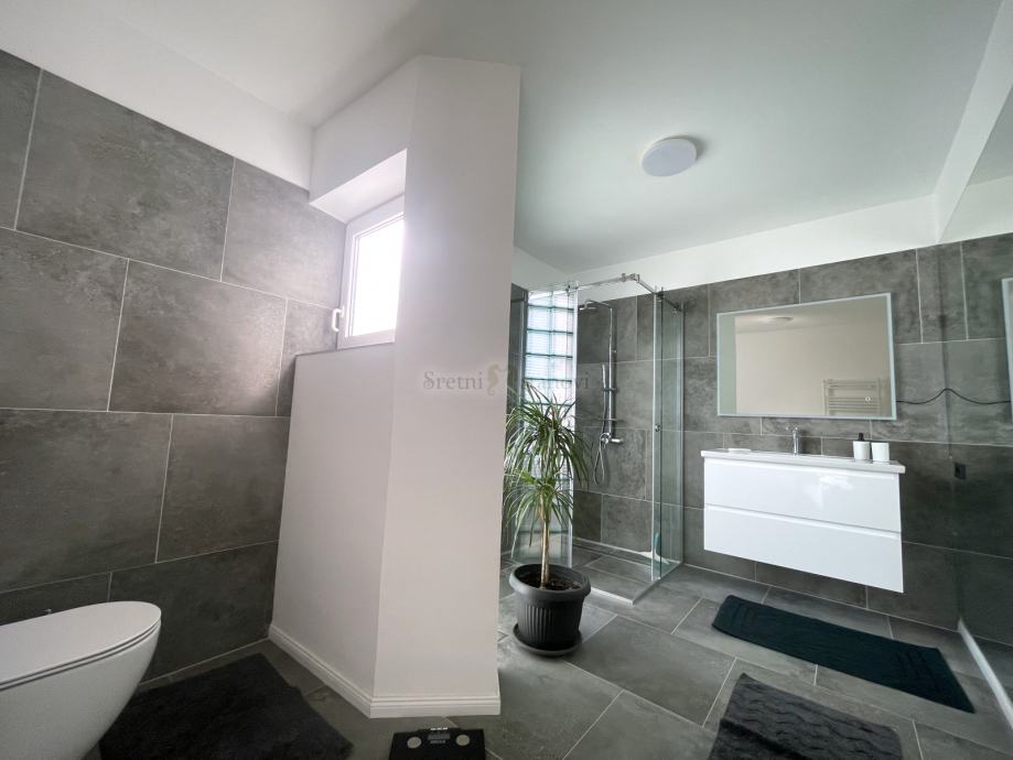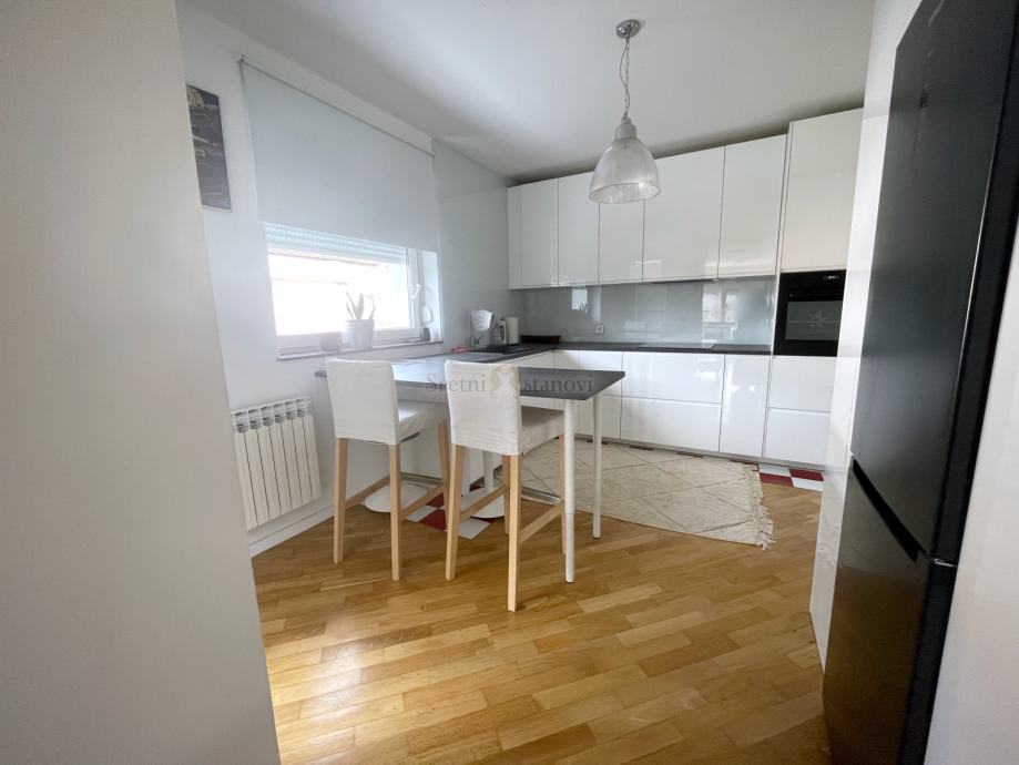 Stan se nalazi na 1. katu stambene zgrade te ima 150 m2 te se sastoji od ulaza, velikog dnevnog boravka s blagovaonom i kuhinjom, balkona, hodnika, 3 spavaće sobe, kupaone i dodatnog WC-a.
