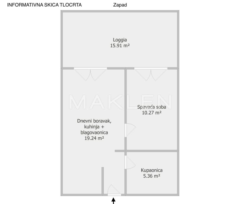 Sastoji se od dnevnog boravka s blagovaonicom i kuhinjom, spavaće sobe, kupaonice s wc-om, hodnika te loggie.