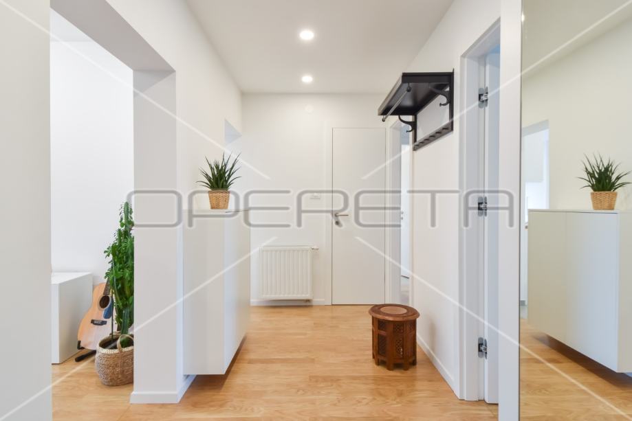 Predivan renovirani stan u potpunosti namješten. Stan se sastoji od ulaznog hodnika, tri spavaće sobe, kupaonice, prostranog dnevnog boravka sa blagovaonicom koji imaju izlaz na balkon i komunikaciju sa kuhinjom. Svijetao i ugodan stan, namještaj izrađen po mjeri, ukusno i pomno birani svi materijali i pokućstvo.
