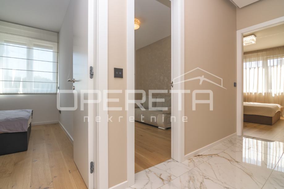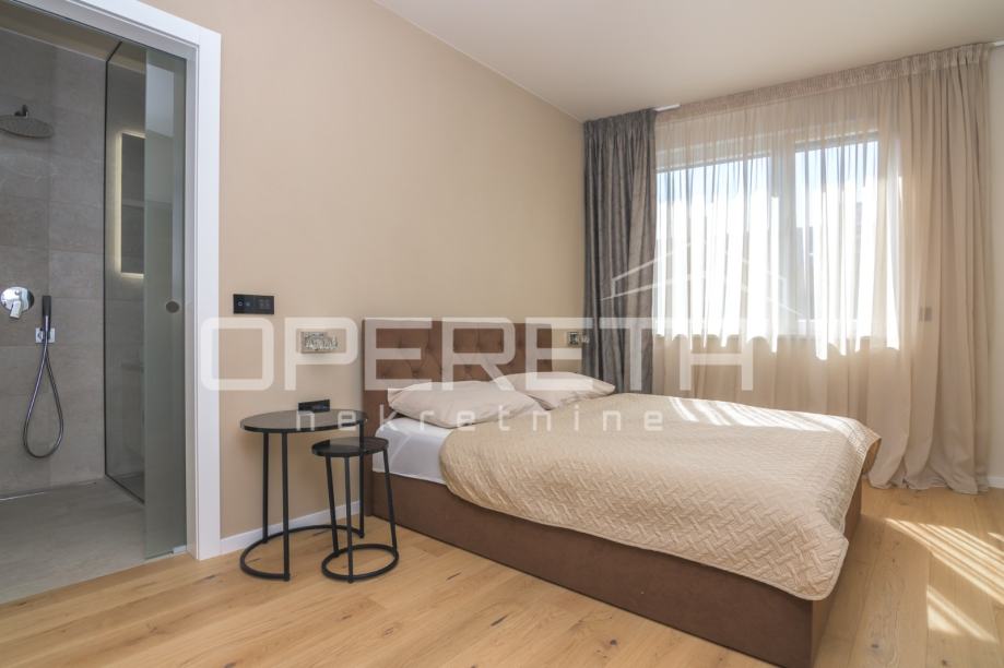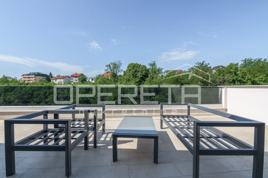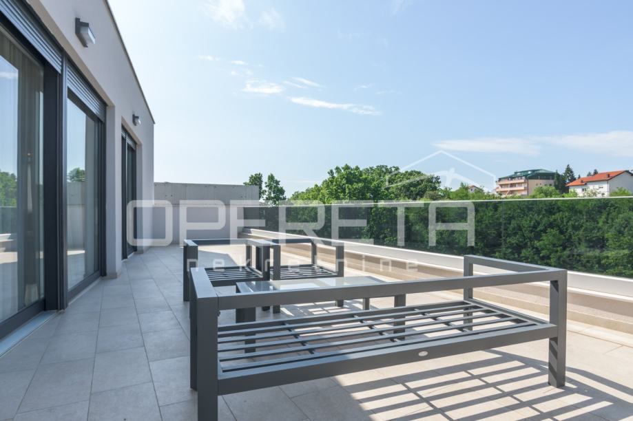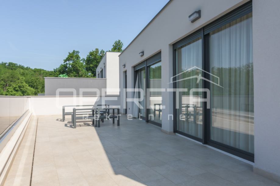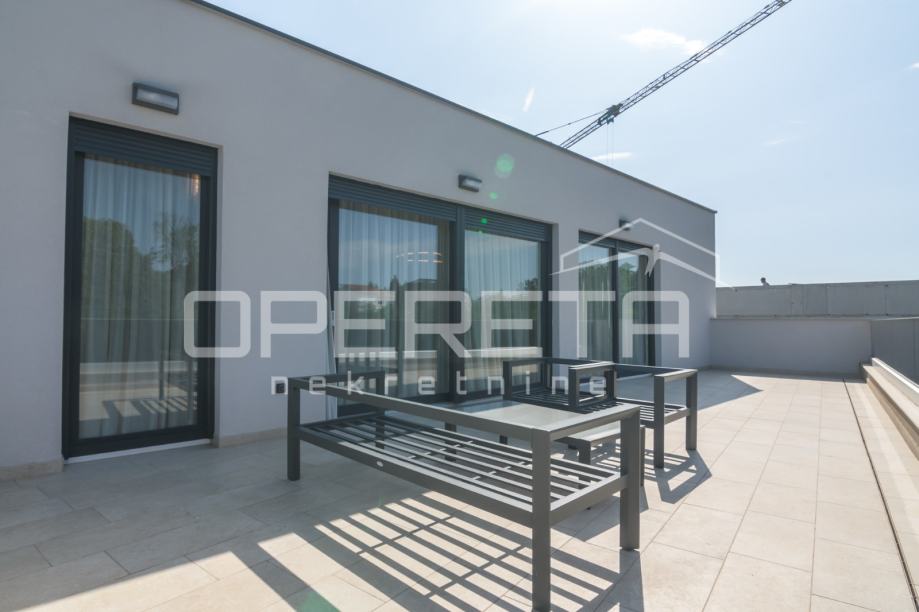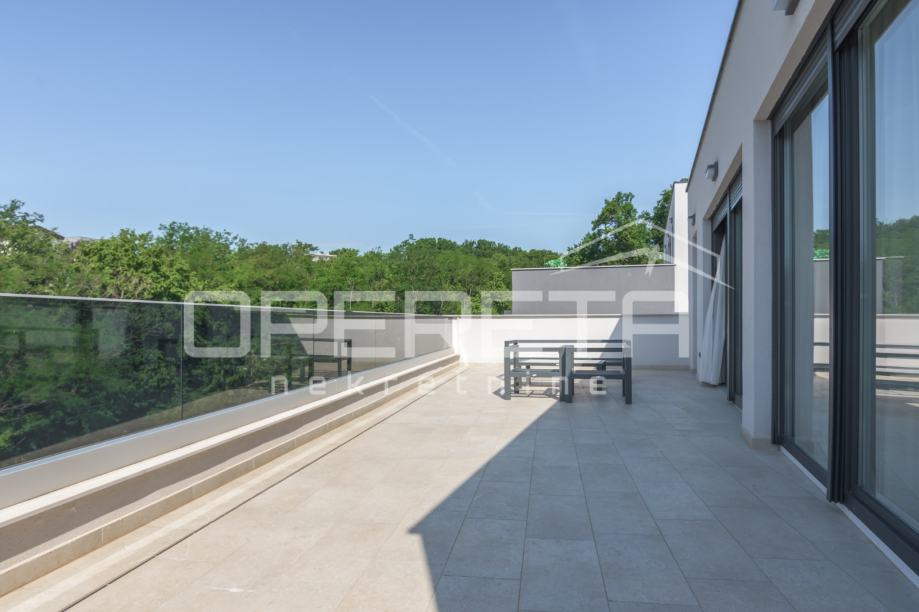 Iznajmljuje se penthouse u novogradnji 112m2 + 45m2 nenatkrivene terase s pogledom na šumu i zelenilo + 2 vanjska parkirna mjesta (natkriveno s pripremom za punionicu i nenatkriveno) + spremište. Sastoji se od prostranog dnevnog boravaka s terasom orijentiranom na zapad, kuhinje sa svim kućanskim aparatima, kupaonice te 3 spavaće sobe od kojih je jedna master bedroom s vlastitom kupaonicom i walk in ormarom.