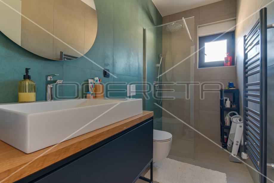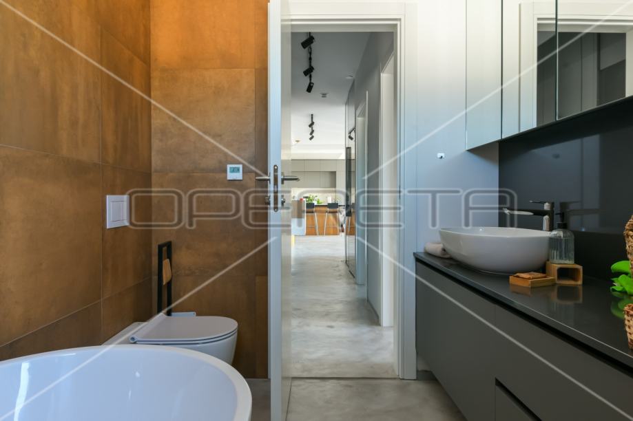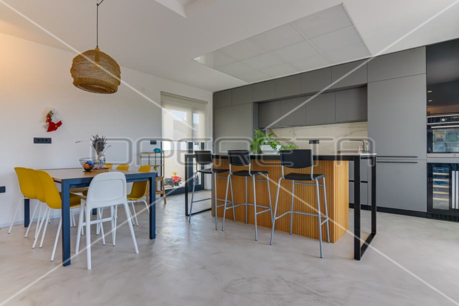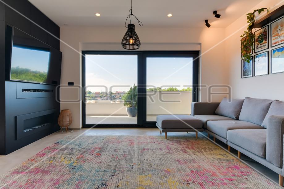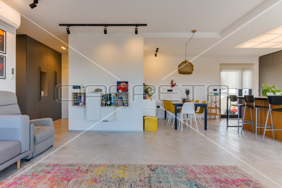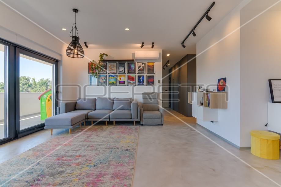 Stan se rasprostire na 105 m2 stambenog prostora s tri spavaće sobe, dvije kupaonice i gostinjskim toaletom. Dnevni boravak povezan je s blagavaonicom i kuhinjom iz koje se izlazi na balkon i veliku, natkrivenu terasu.