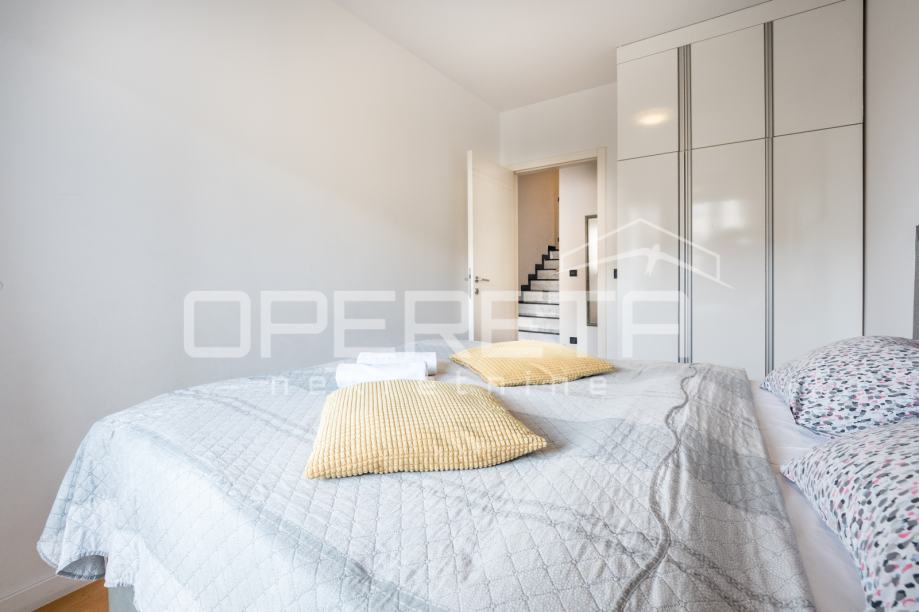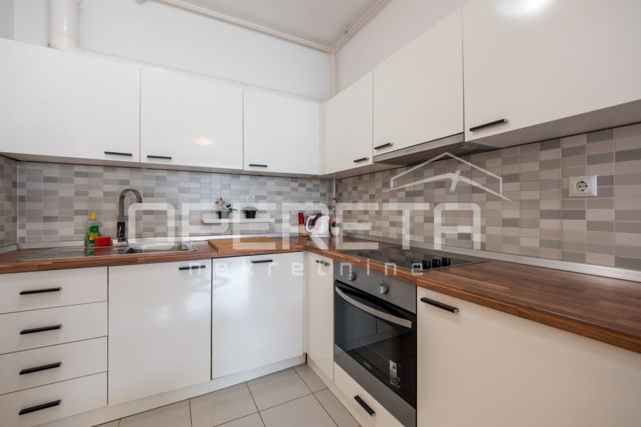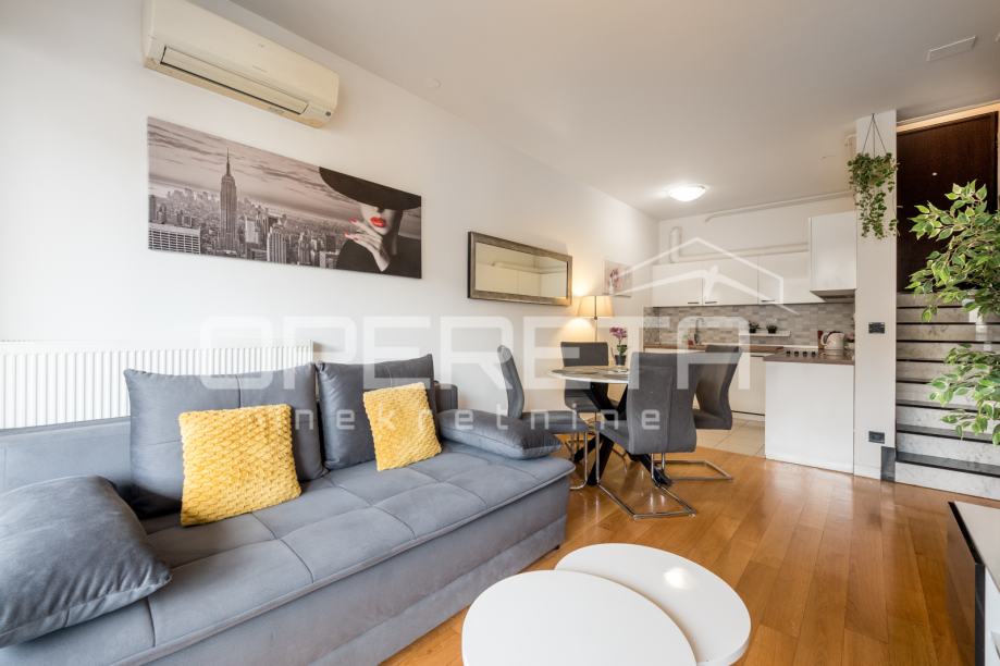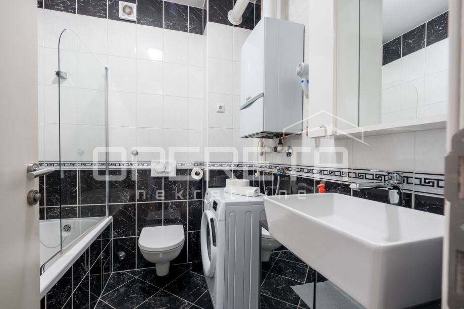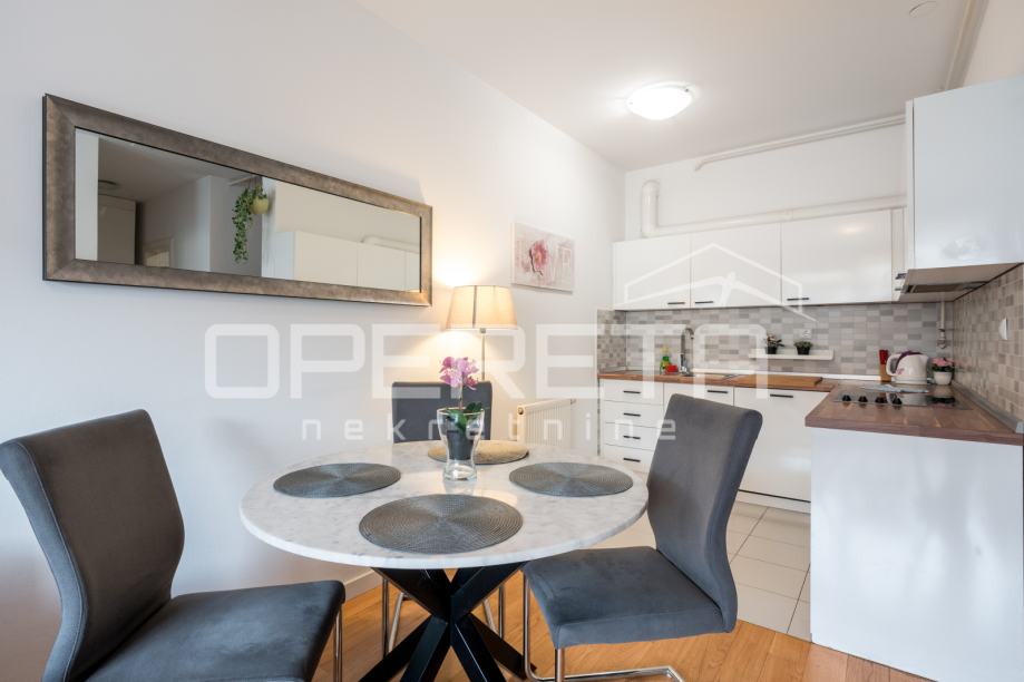 Funkcionalni raspored stana; kupaonica, kuhinja, spavaća soba, dnevni boravak s blagovaonicom i izlazom na loggiu. Potpuno opremljen vrhunskim uređajima i modernim namještajem, idealan za poslovne ljude, samca ili par.