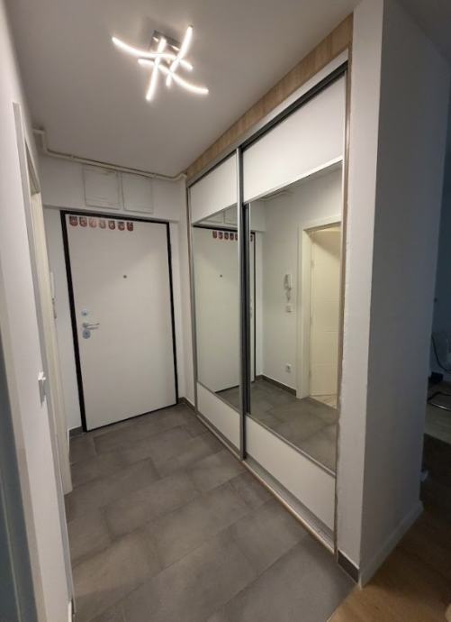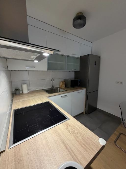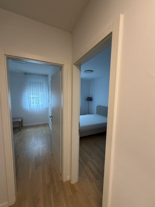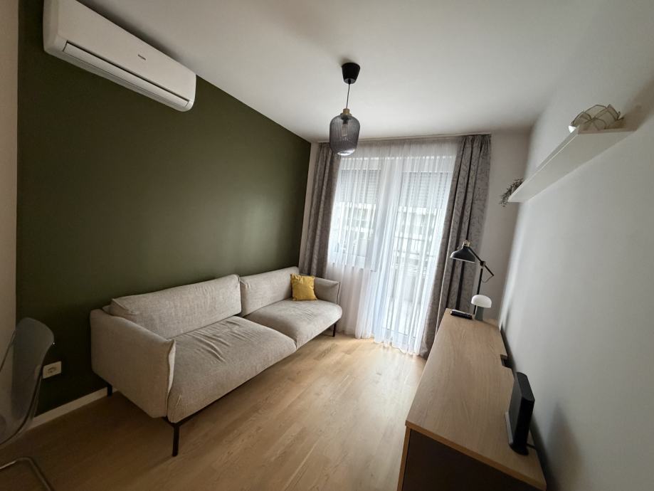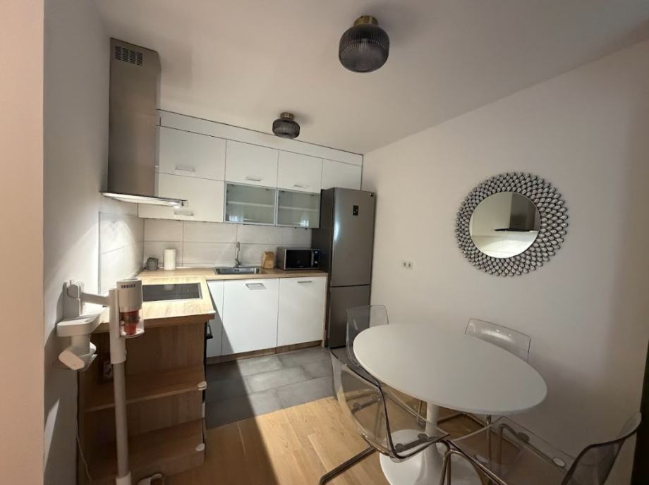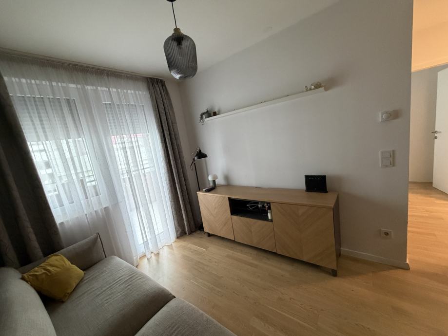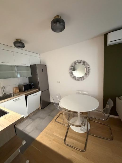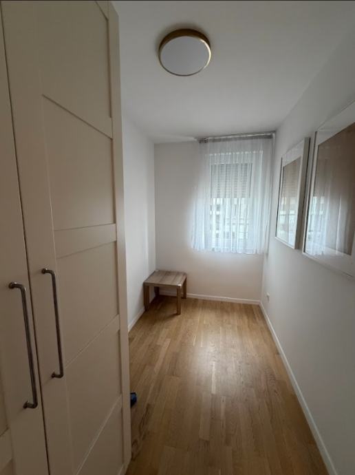 Funkcionalni raspored stana; kupaonica, kuhinja, 2 spavaće sobe, dnevni boravak s blagovaonicom i izlazom na loggiu. Potpuno opremljen vrhunskim uređajima i modernim namještajem, idealan za poslovne ljude, samca ili par.