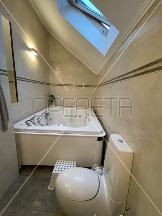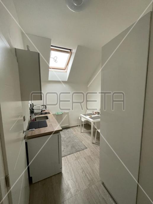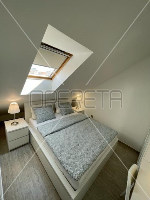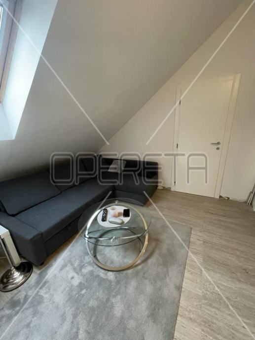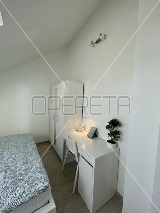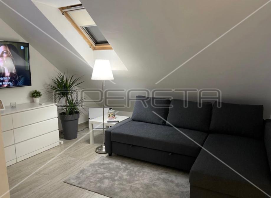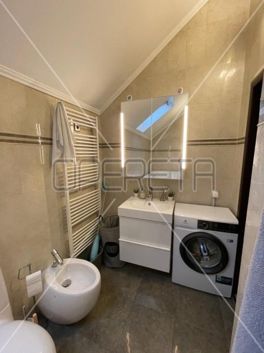 2soban stan na 3.katu/ u visokom potkrovlju. Sastoji se od dnevnog boravka, kuhinje s blagovaonicom, spavaće sobe i kupaonice. Stan je u zgradi novije gradnje, moderan i kompletno namješten i opremljen. Režije fiksno iznose 200eur, internet uključen.