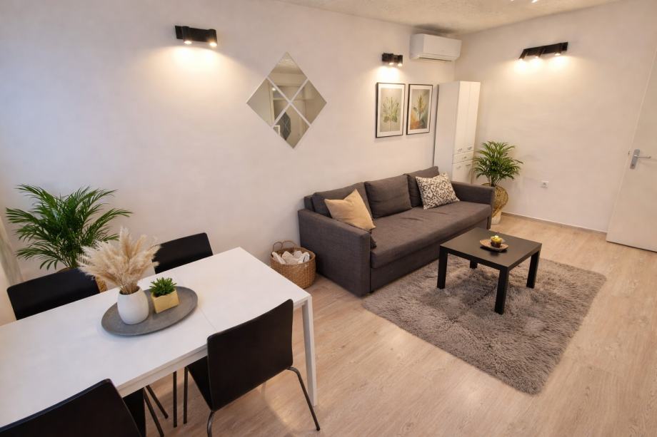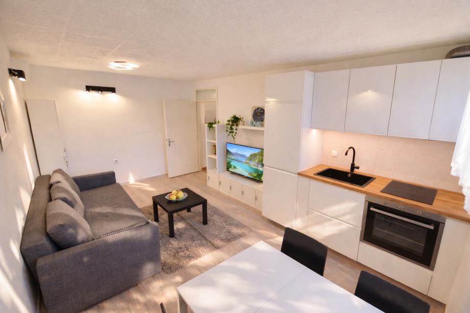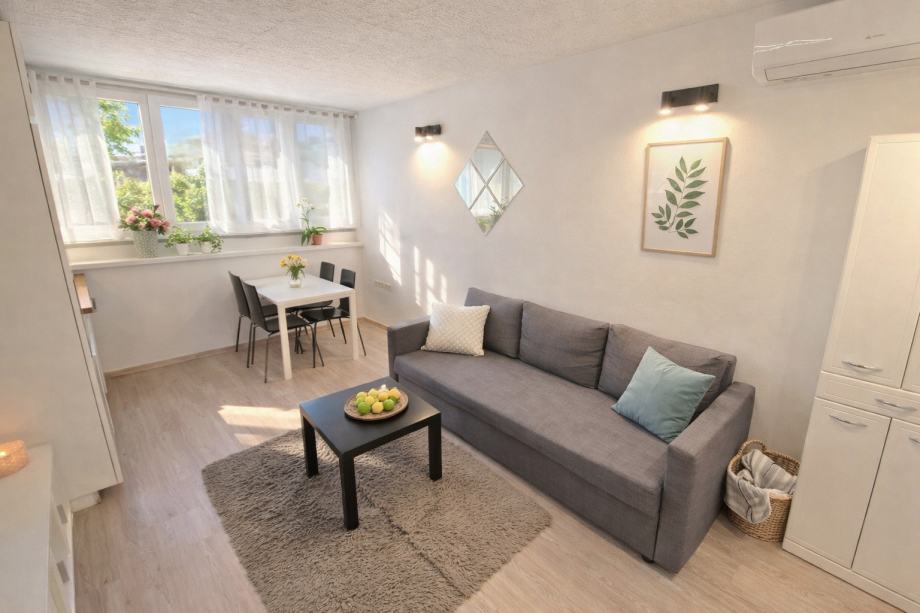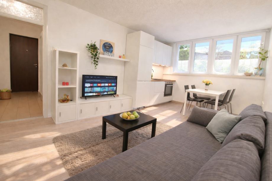 Iznajmljujemo potpuno renovirani i namješteni stan; dnevni boravak s blagovaonom, jedna spavaća soba, kupaona, spremište.