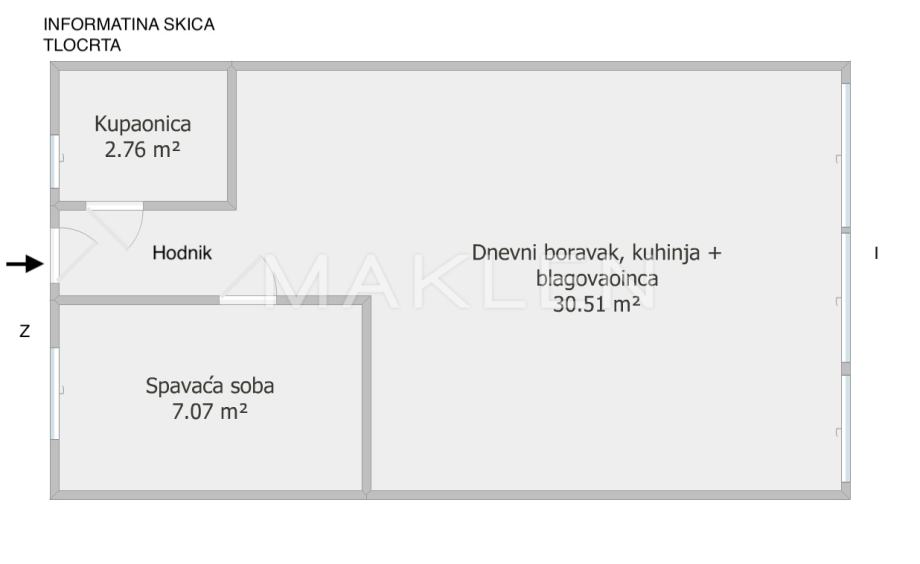 Stan se sastoji od dnevnog boravka s kuhinjom i blagovaonicom, spavaće sobe, kupaonice te hodnika.