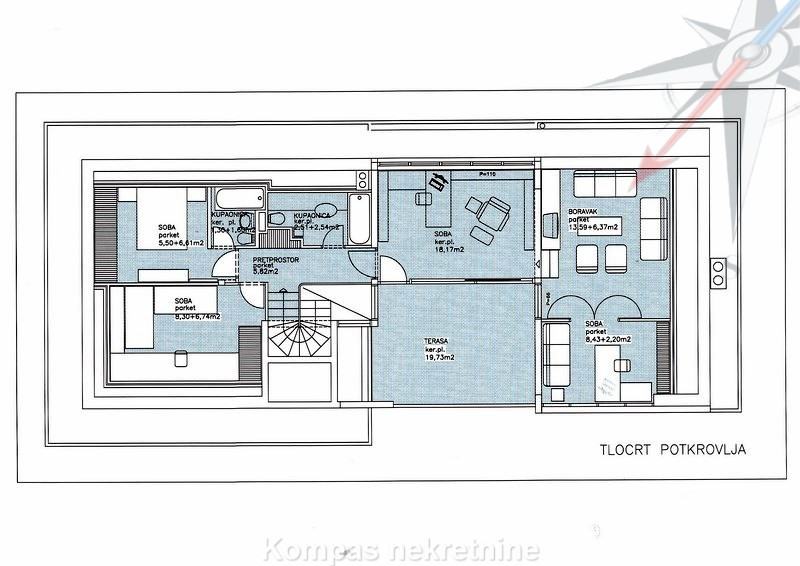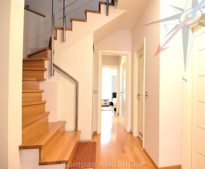 GORNJA ETAŽA: Dnevni boravak, kuhinja i blagovaona (50 m2), dvije spavaće sobe (15+12 m2), kupaonica sa tuš kabinom (6 m2), toalet (3 m2), predprostor (6 m2), terasa (20 m2).