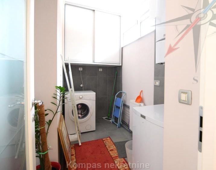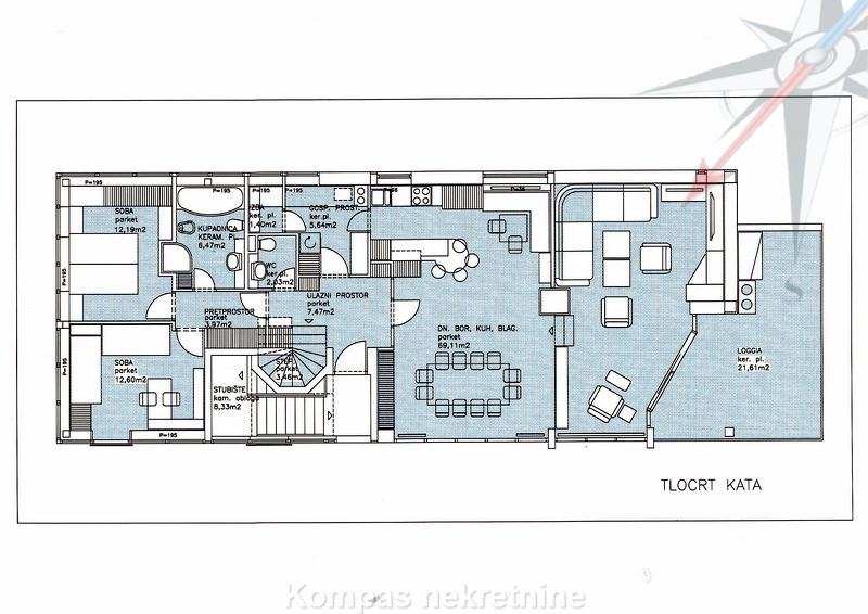DONJA ETAŽA: dnevni boravak, kuhinja i blagovaona (70 m2), dvije spavaće sobe (12.5 m2 i 12.5 m2), loggia uz dnevni boravak (22 m2), kupaonica sa hidromasažnom kadom (7 m2), kupaonica sa turskom kupelji (3 m2), predprostor (4 m2 ), ulazni prostor (7.5 m2), vešeraj (6 m2).