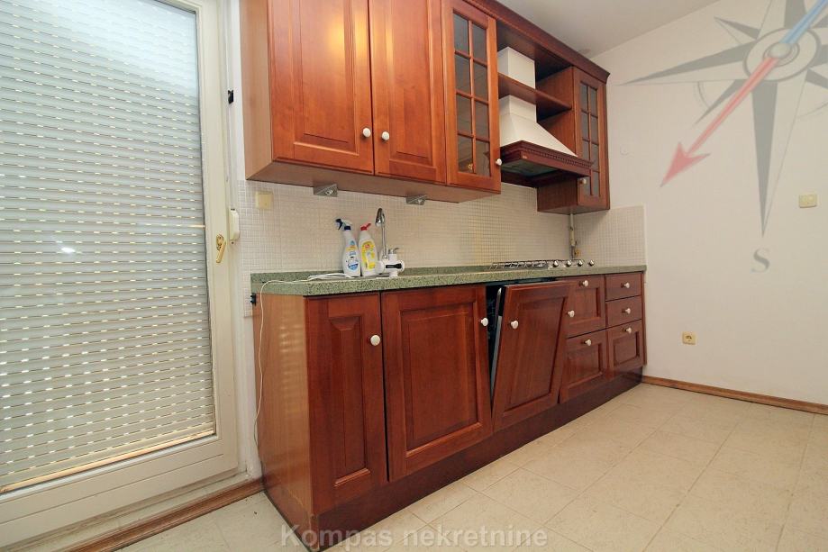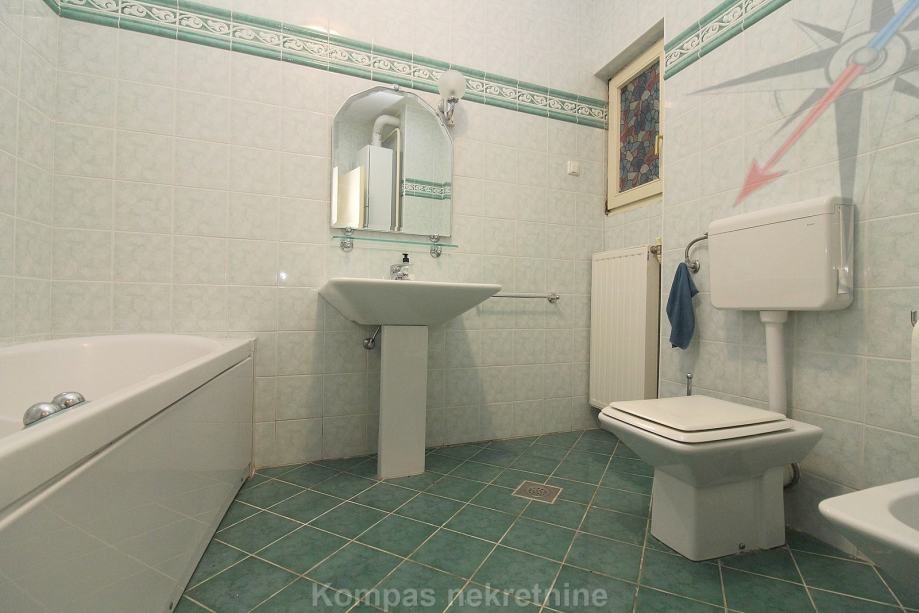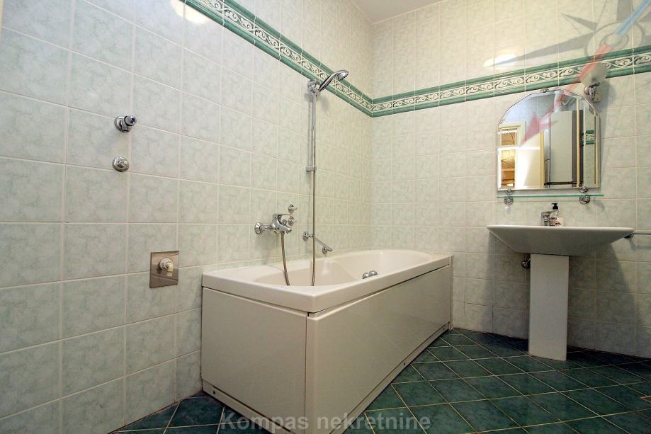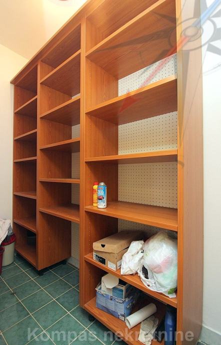 Gornja etaža: veliko predsoblje, tri spavaće sobe, opremljena kuhinja s izlazom na terasu, dvije kupaonice, ostava i veliki dnevni boravak s izlazom na terasu ( 15 m2 ) koja okružuje stan.